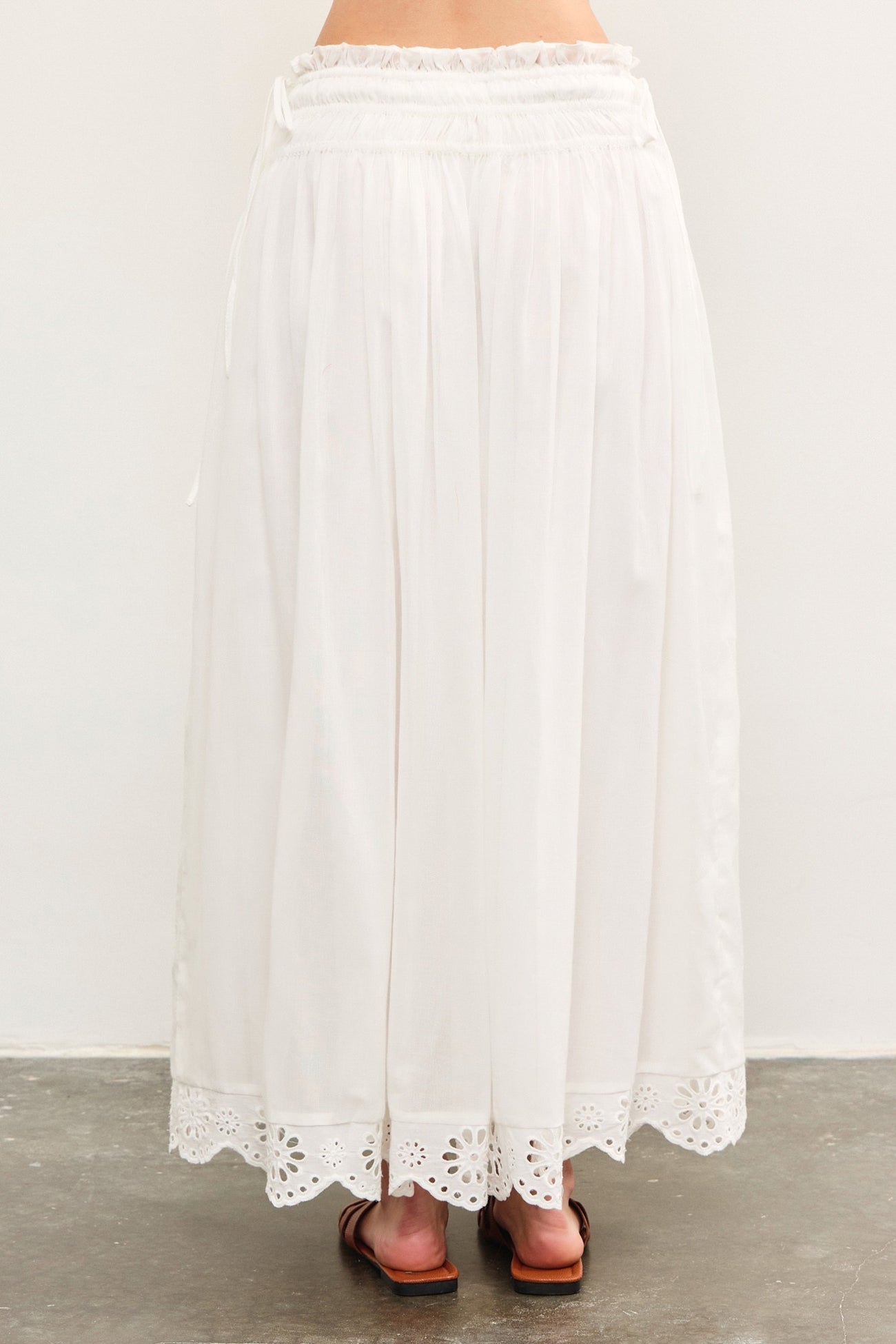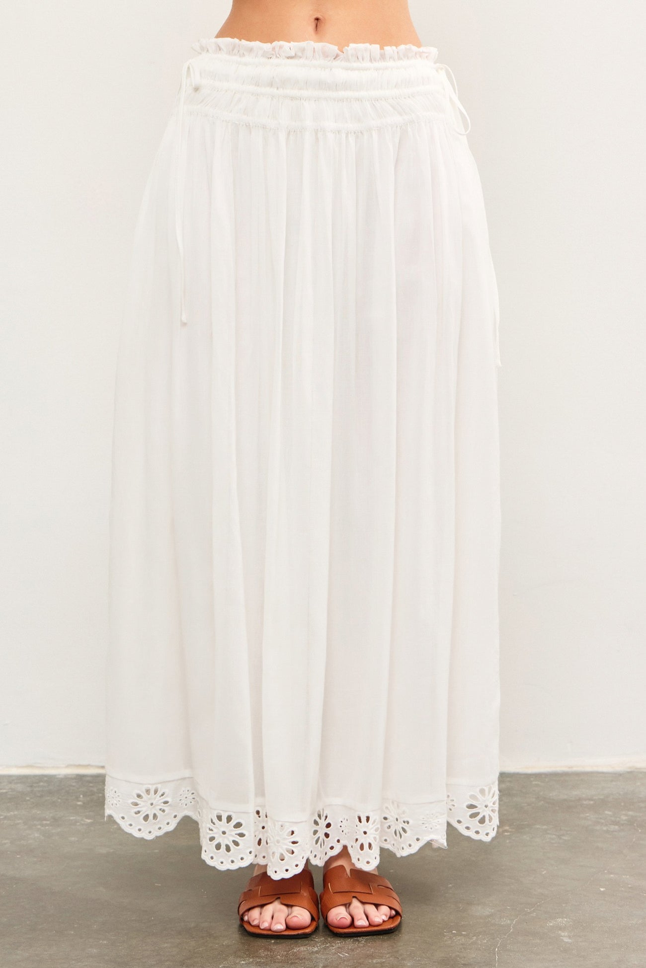 White Smocked Waist Eyelet Lace Hem Maxi Skirt