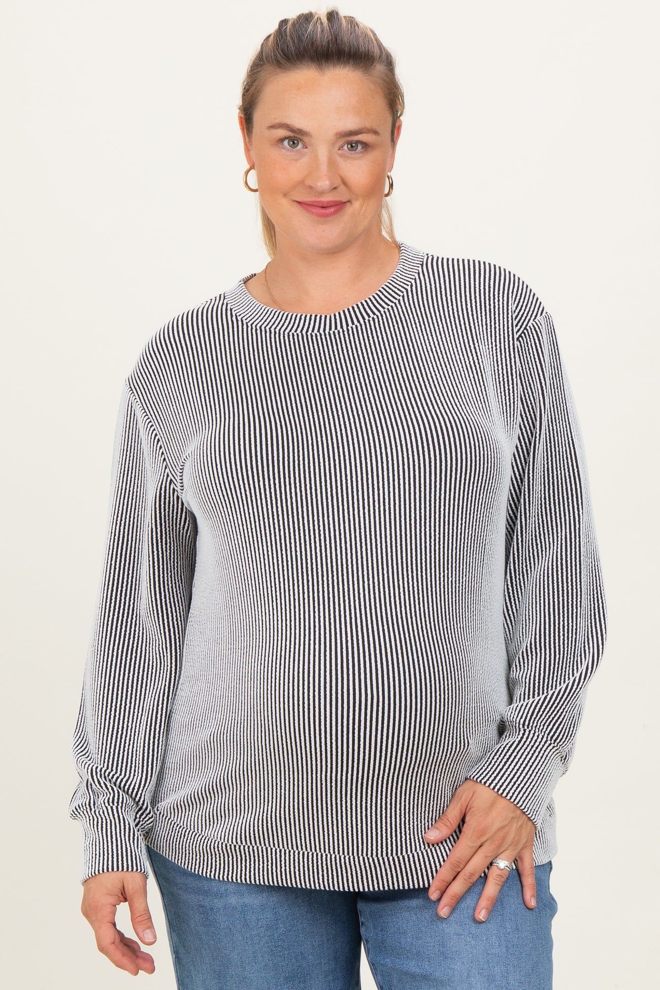 White Stripe Textured Ribbed Long Sleeve Maternity Plus Top