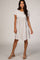A striped babydoll dress with an elastic waist with pleating details, pockets, and a rounded neckline.