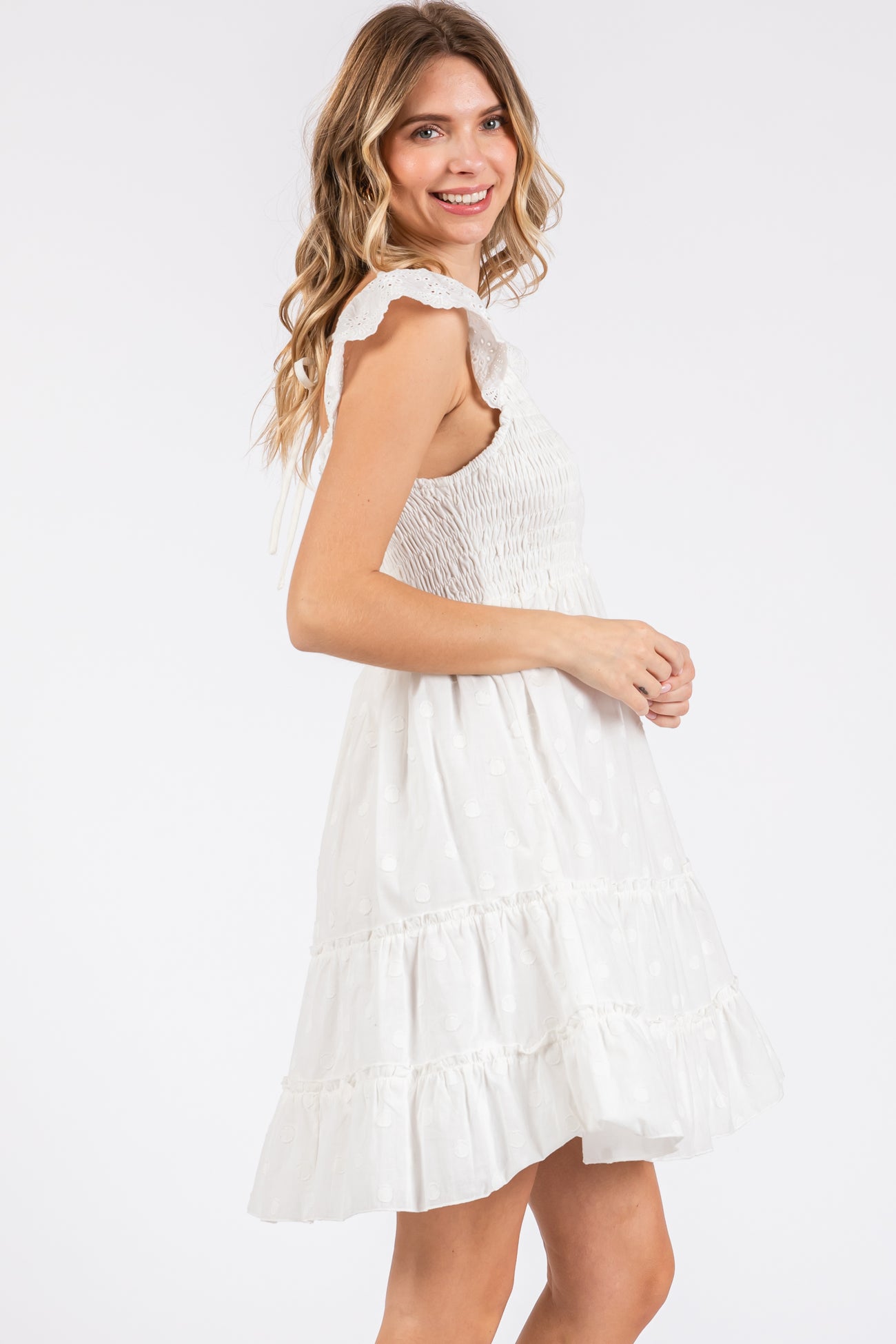 White Textured Polka Dot Eyelet Shoulder V-Neck Dress