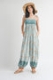 Details A floral border print maternity jumpsuit featuring a straight neckline, a smocked bodice, adjustable tie straps, side pockets and a ruffle hem. Content + Care