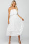 A floral chiffon print maternity midi dress featuring a smocked elastic body with ruffle trim and adjustable cami straps.