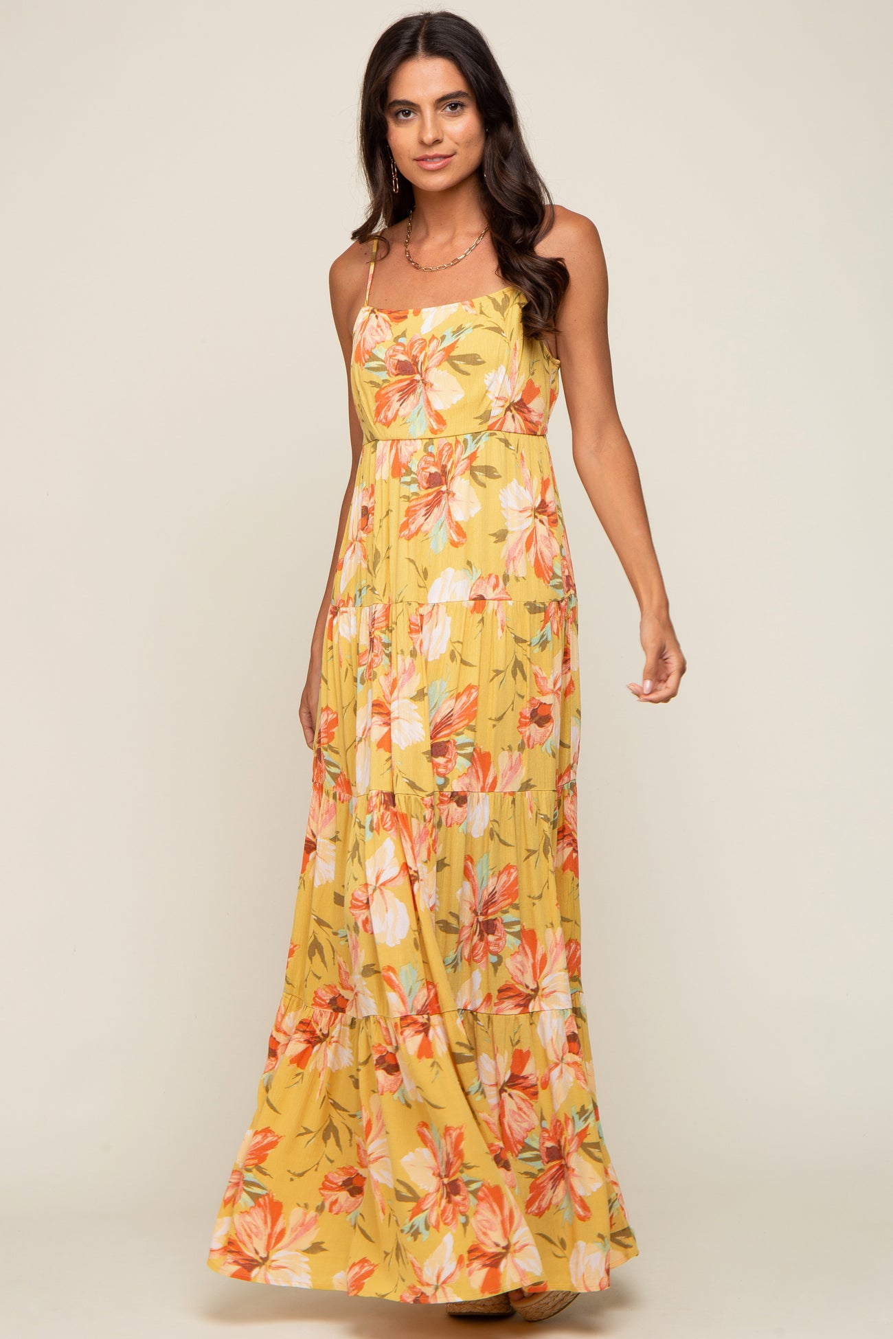 Yellow Floral Sleeveless Tiered Maternity Maxi Dress