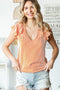 A solid ribbed top with ruffle sleeves and rounded he