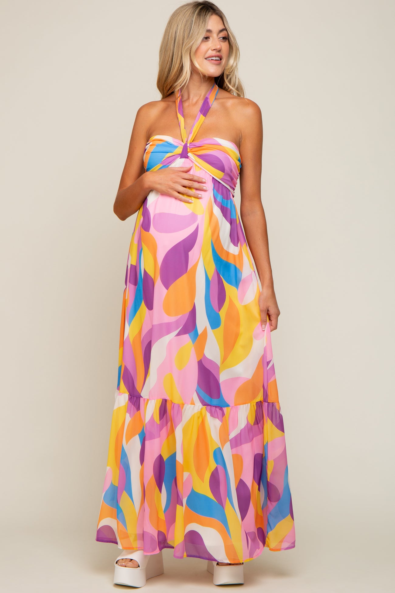 Details A printed maternity maxi dress with a halter neck tie, a ruched bust, a smocked back, and a gathered bottom tier. Dress is fully lined. Content + Care