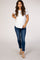 A solid hued maternity jean, featuring five pockets, a raw hem, light destressing and an elastic belly band. Material had high stretch.
