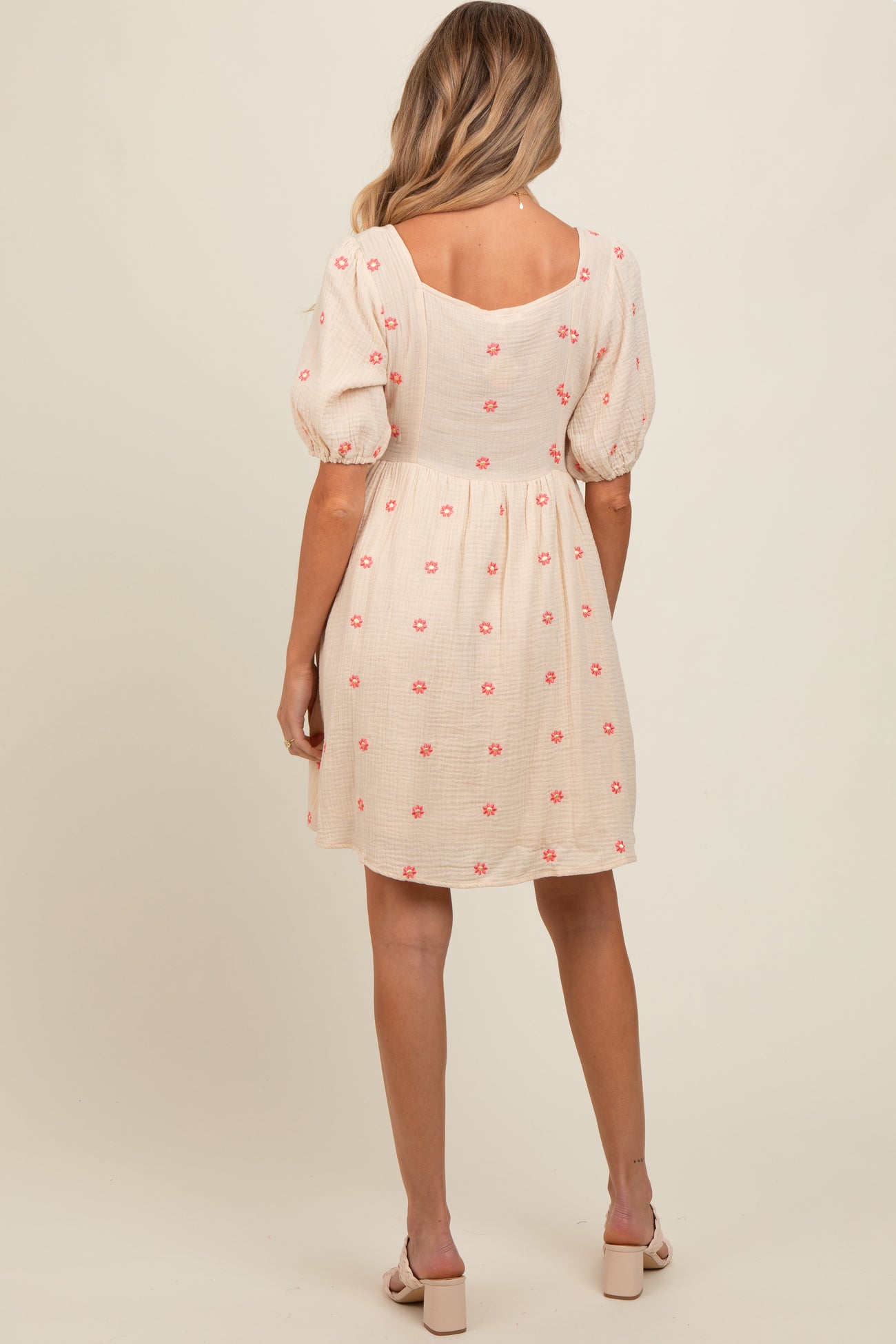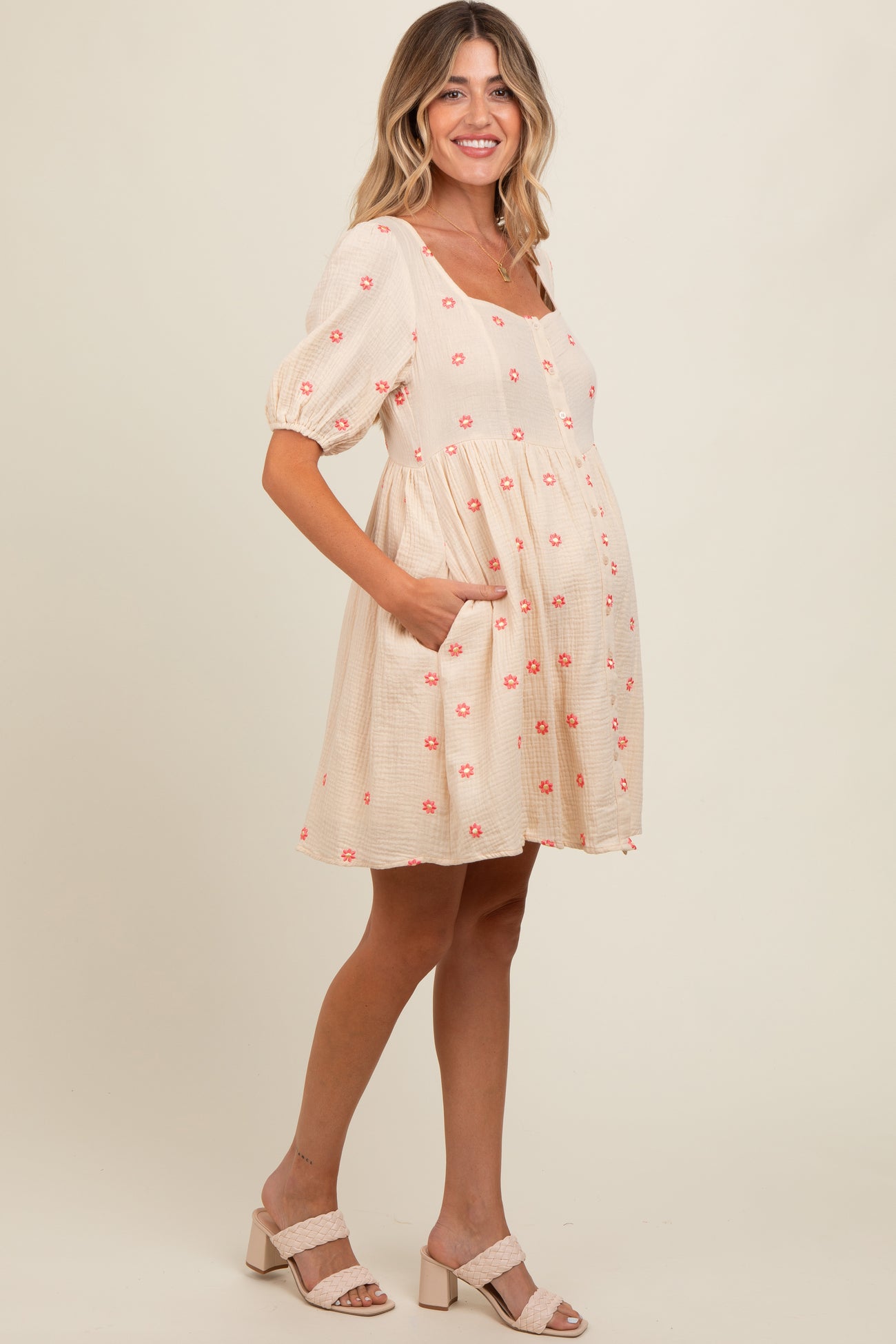 Beige Floral Embroidered Button Front Short Sleeve Maternity Dress