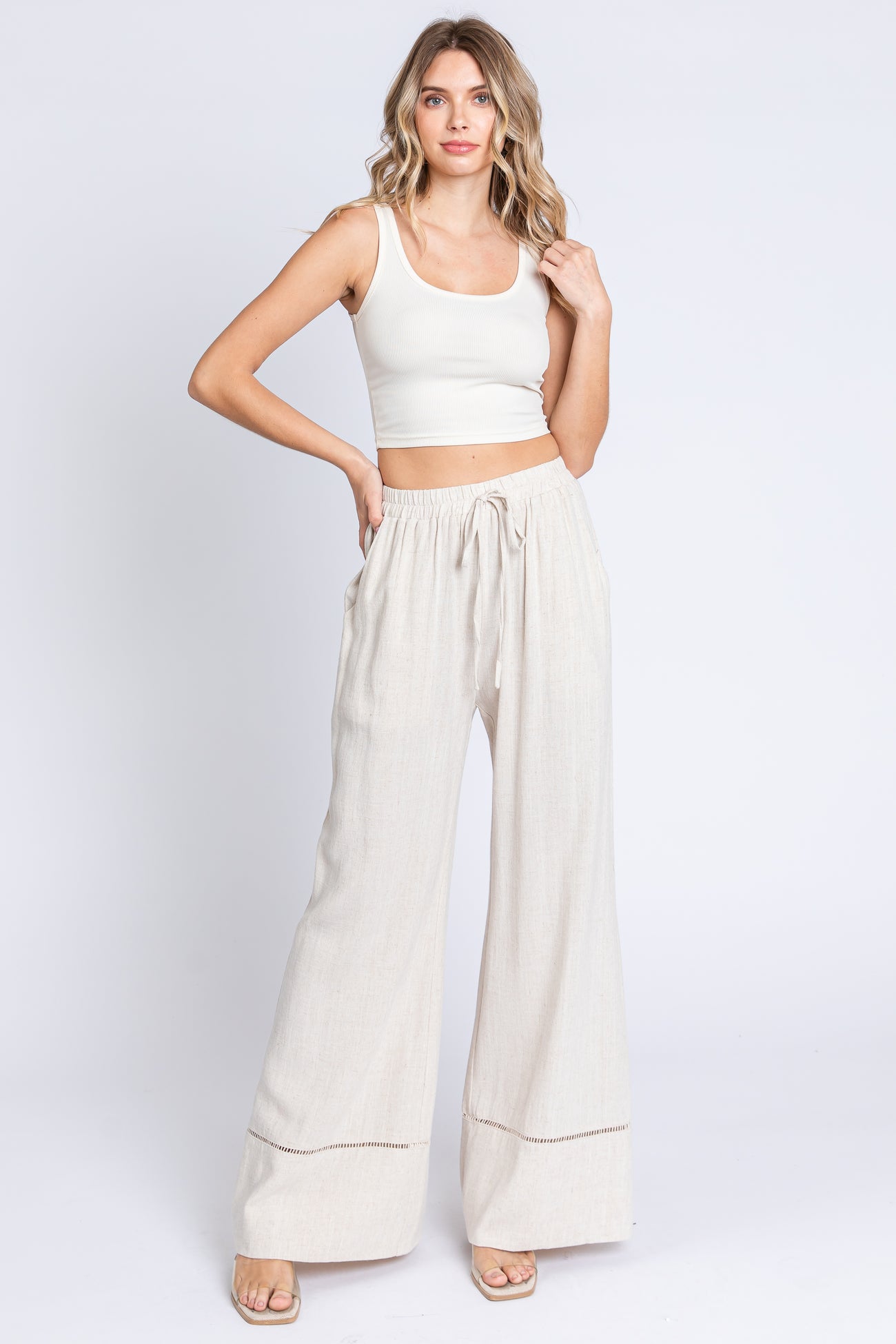A pair of linen pants featuring wide legs with a lace trim, side pockets and a self-tie waist.