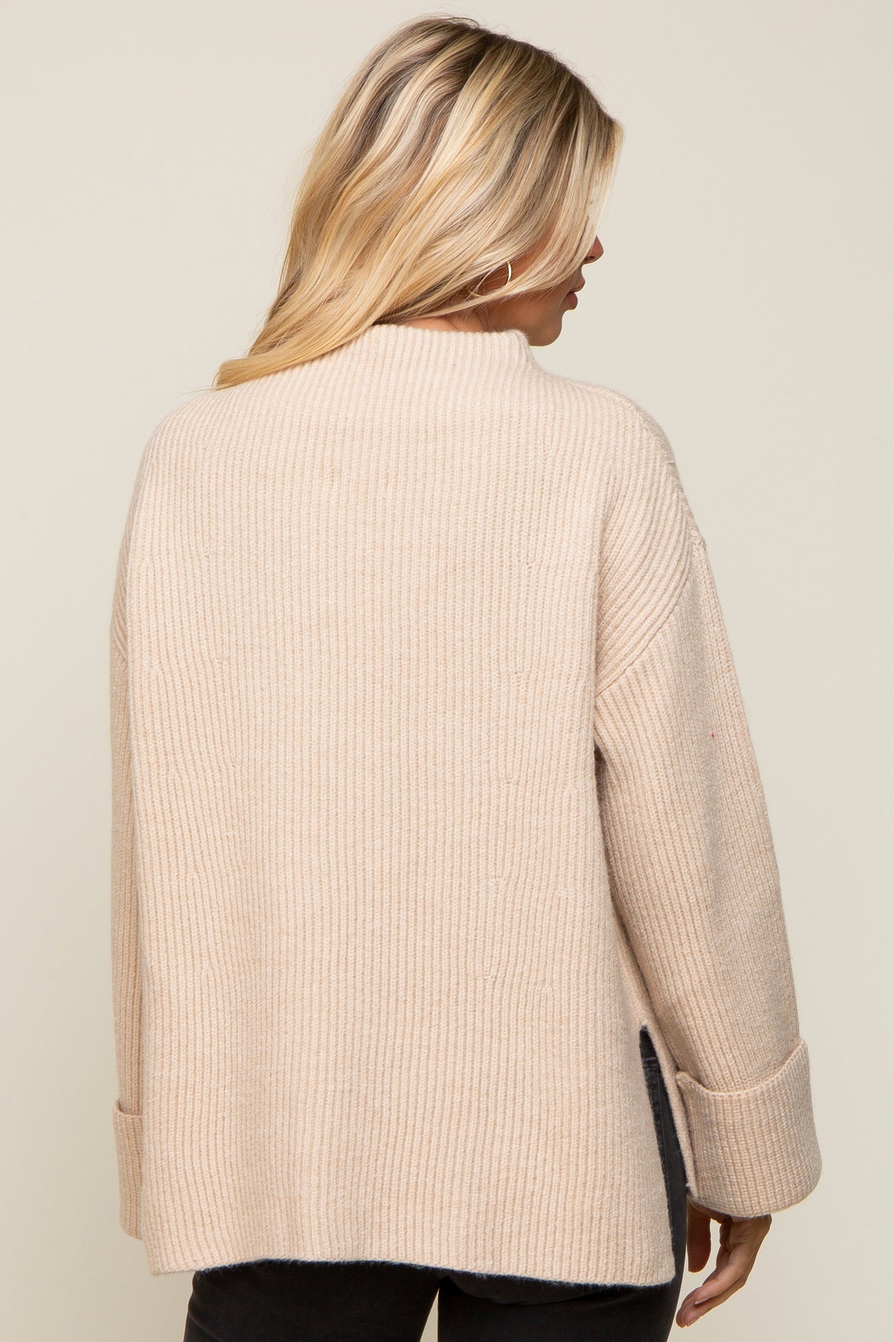 A solid thick knit sweater with a mock neckline, side slits and oversized cuffed sleeves.