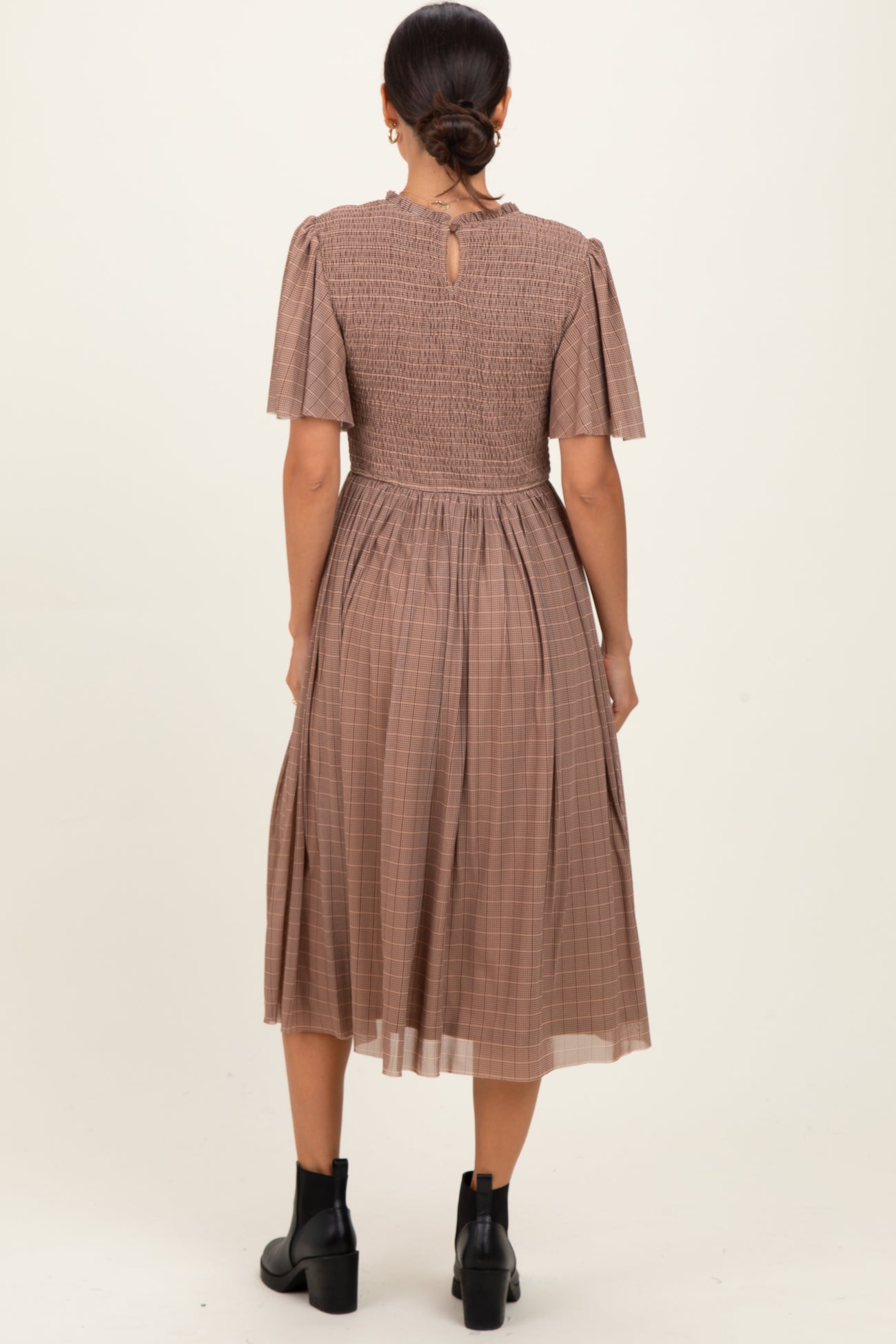 Elevate your wardrobe with this Beige Plaid Smocked Mesh Midi Dress, the perfect blend of comfort and style. Featuring delicate smocking on the bodice for a flattering fit and subtle plaid pattern that adds timeless charm. The airy mesh fabric ensures breathability, while the midi length and flutter sleeves create an effortlessly elegant silhouette. Ideal for casual outings, brunch dates, or office wear, this dress pairs beautifully with ankle boots or sandals. Embrace feminine sophistication with its soft beige tones and versatile design, making it a must-have piece for every season.