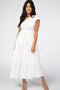 Details A polka dot printed chiffon dress with short sleeves, a tiered skirt, a rounded neckline with button down detailing, and double lined to prevent sheerness. Content + Care