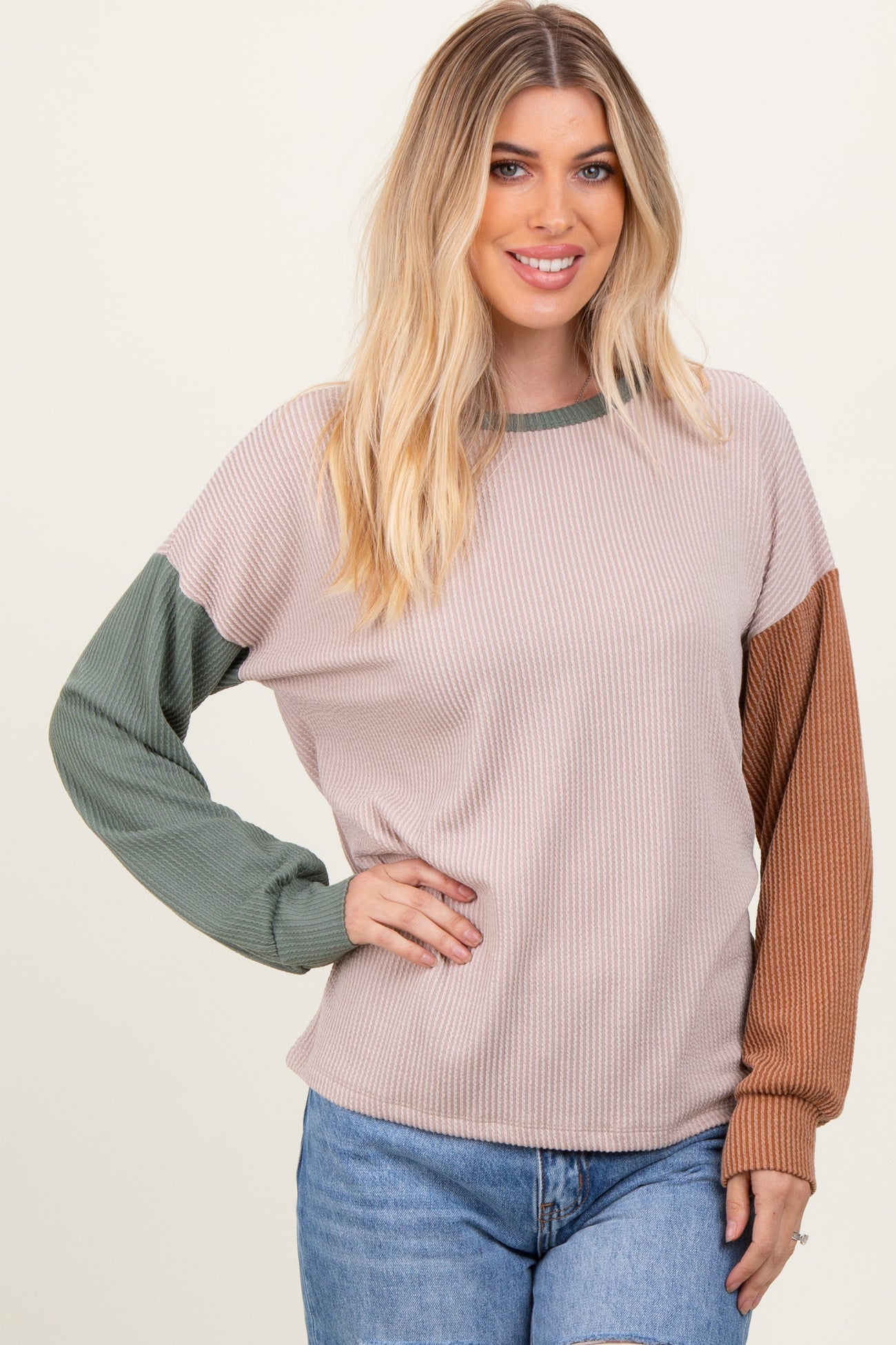 Beige Ribbed Colorblock Sleeve Long Sleeve Top