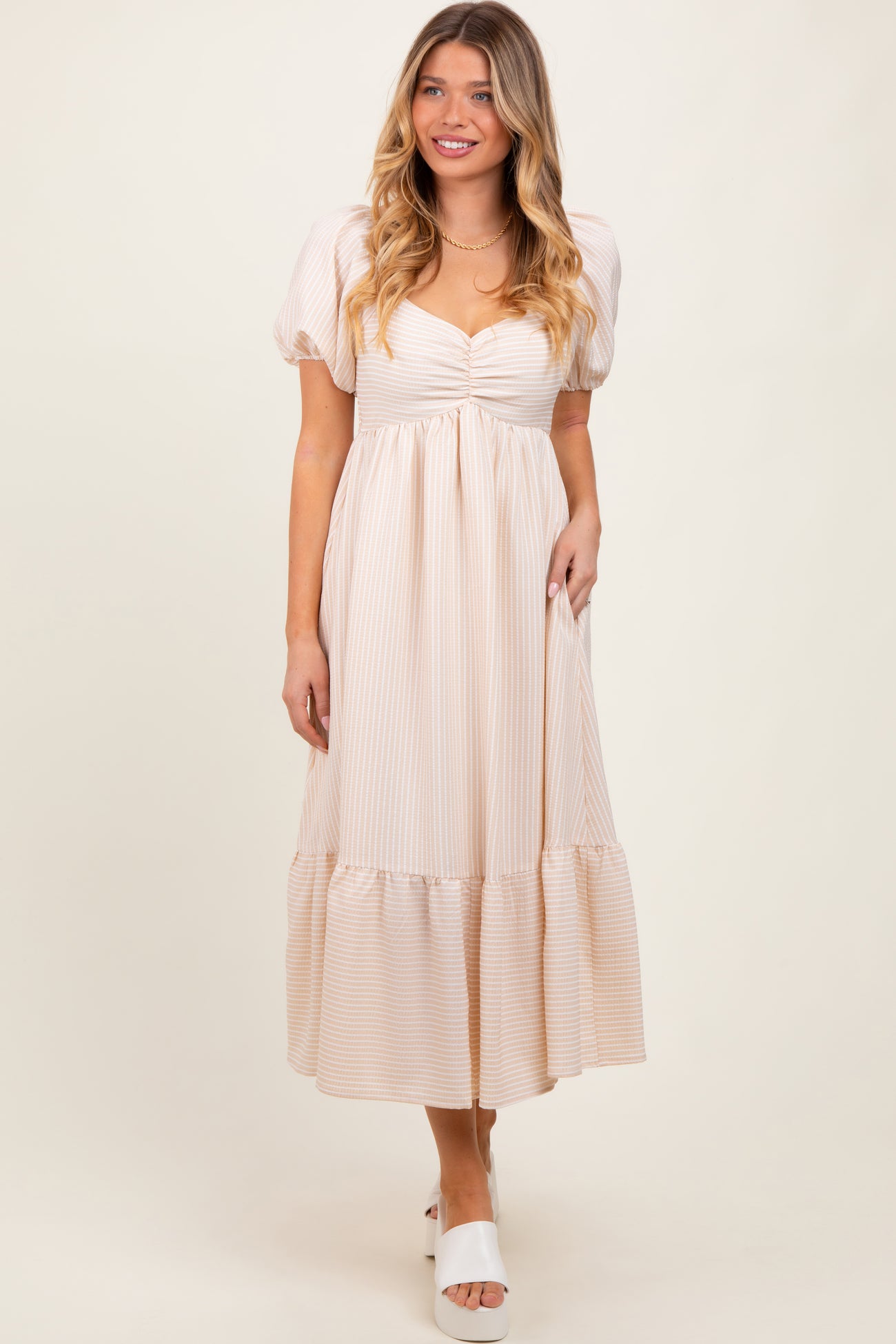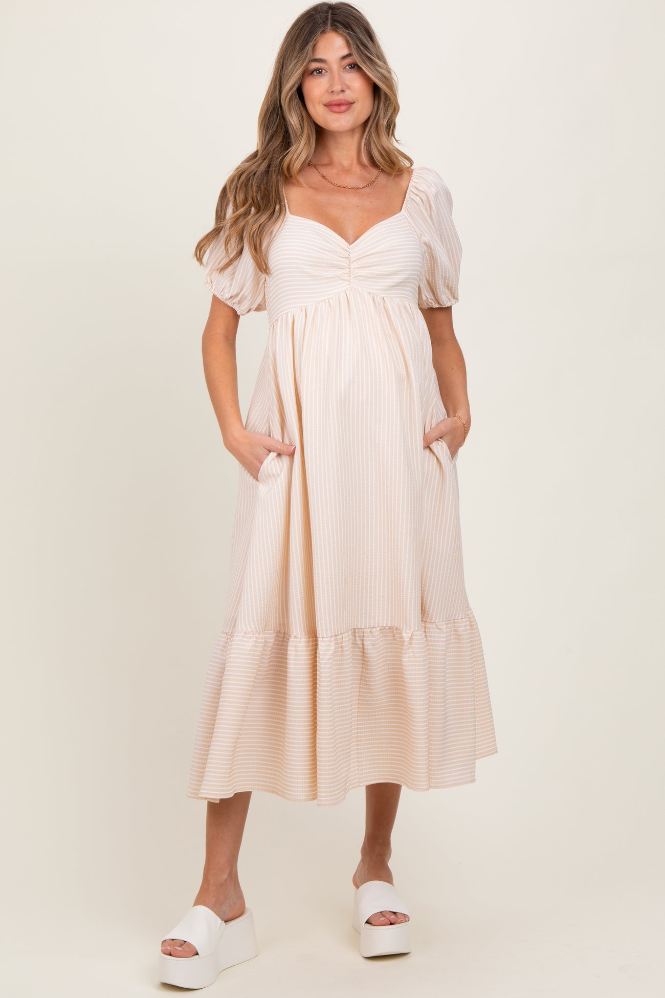 Beige Sweetheart Stripe Smocked Back Maternity Midi Dress