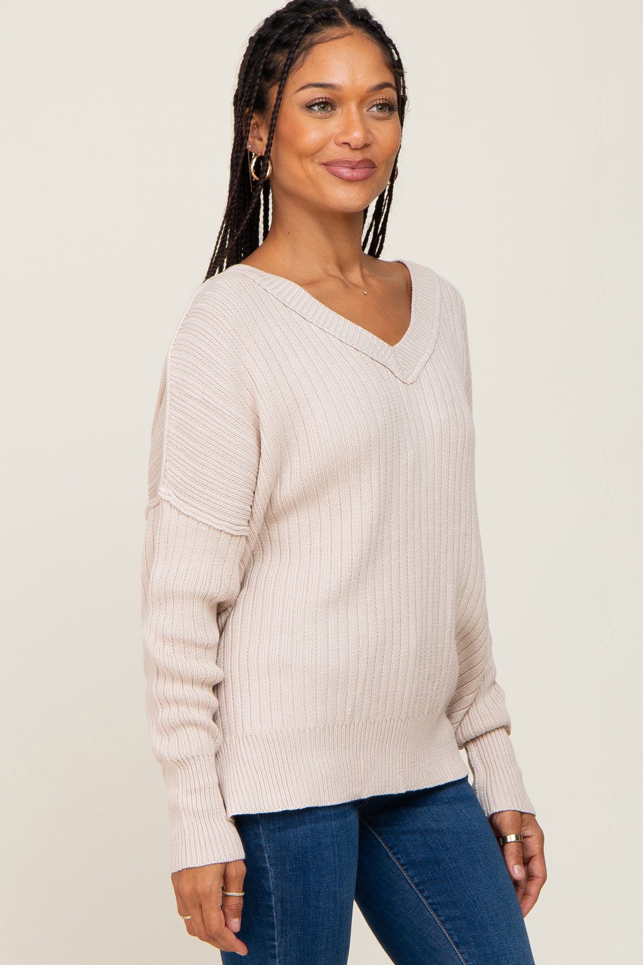 Beige V-Neck Oversized Sweater