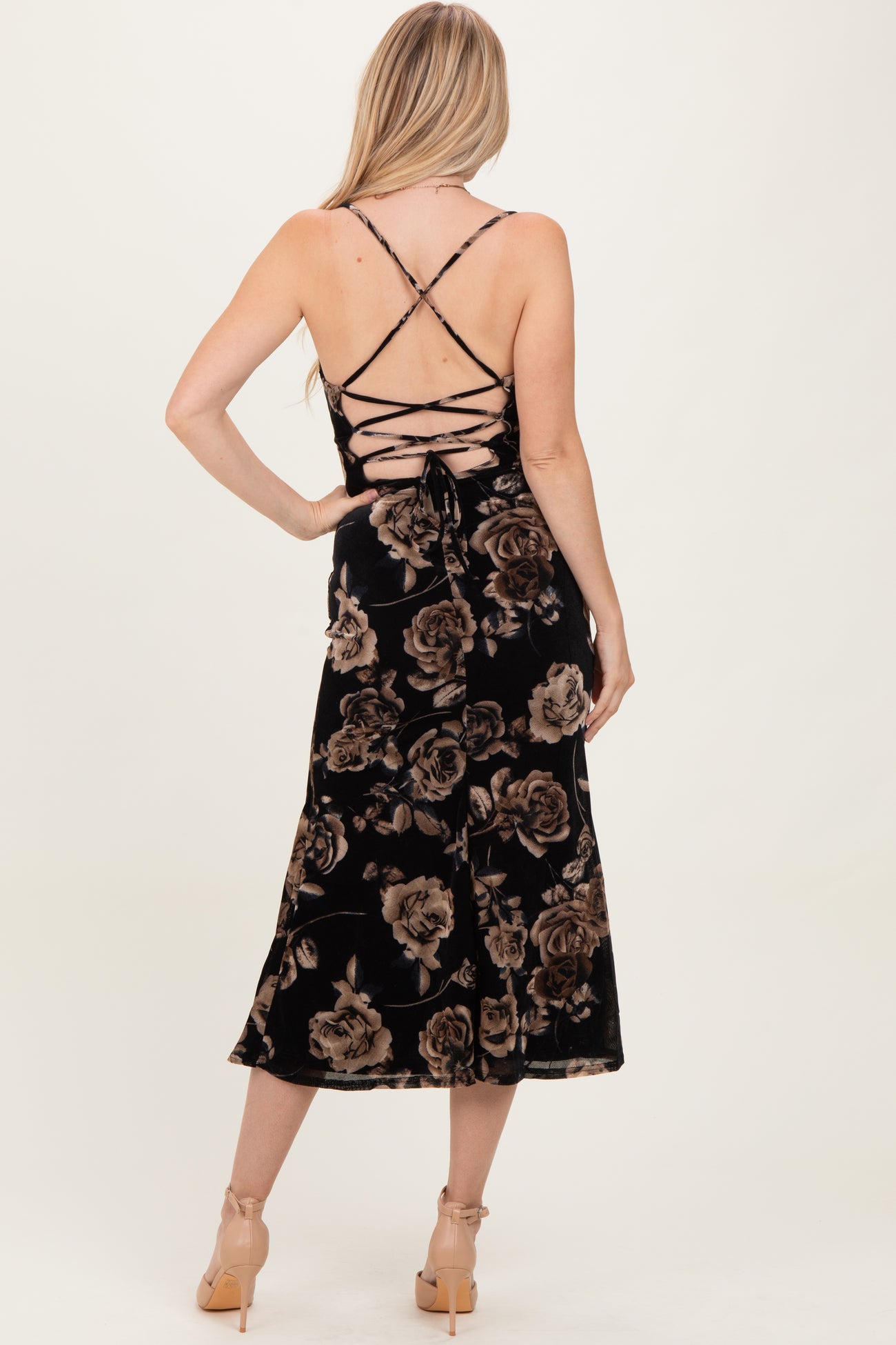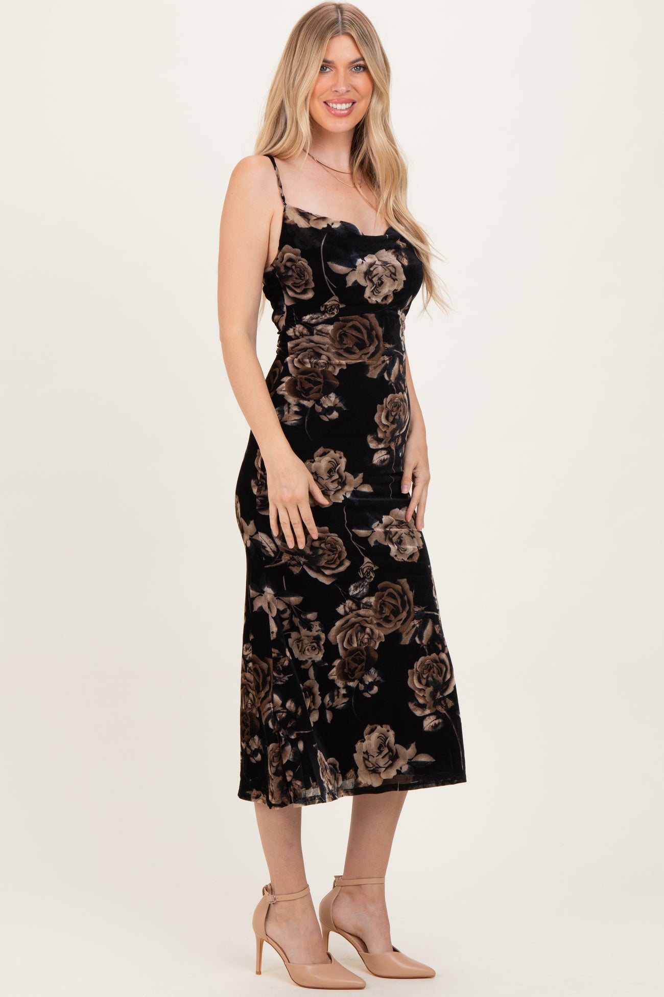 Elevate your style with this stunning cowl neck midi dress, featuring a delicate lace-up back detail that adds a touch of allure. The slim fit silhouette hugs your curves beautifully, while the midi length offers a sophisticated edge perfect for special occasions or an elegant night out. Crafted with plush velvet fabric adorned with a bold floral pattern, this dress combines comfort with standout style. Adjustable spaghetti straps ensure a perfect fit. Pair it with heels and minimal jewelry for a chic, timeless look that turns heads wherever you go.