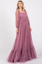A solid short sleeve maxi dress with a deep v-neckline, ruffle accent sleeves, button down closure in front and tie accent in back. Skirt is partially lined. Pocketed.