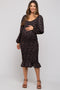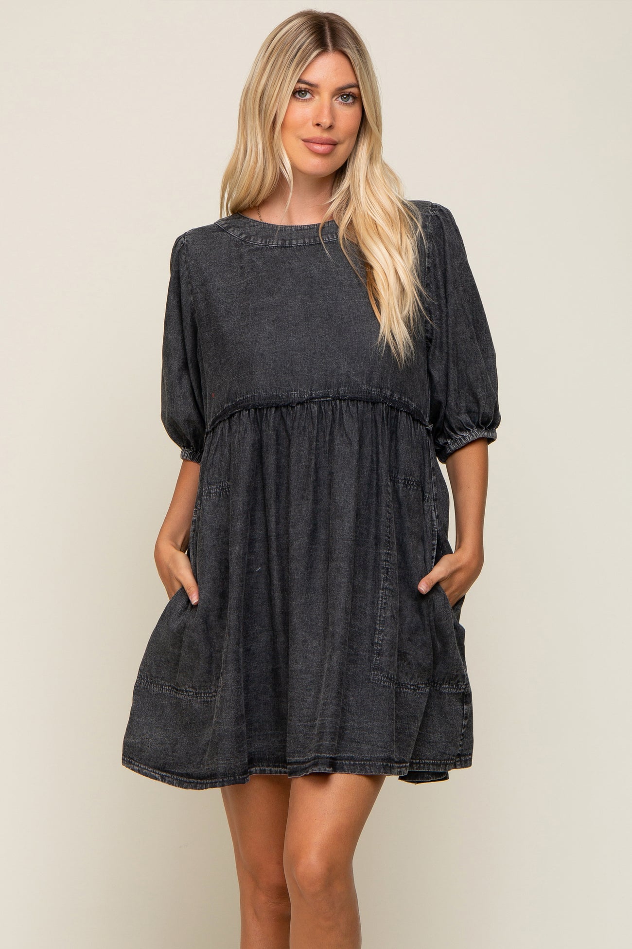 A solid maternity mini dress with puff sleeves and fringe accent. Includes side pockets and keyhole button closure at back.
