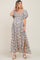 A floral print maternity maxi with short sleeves, a squared neckline, a smocked bodice, and side slits at the hem. Skirt is partially lined.