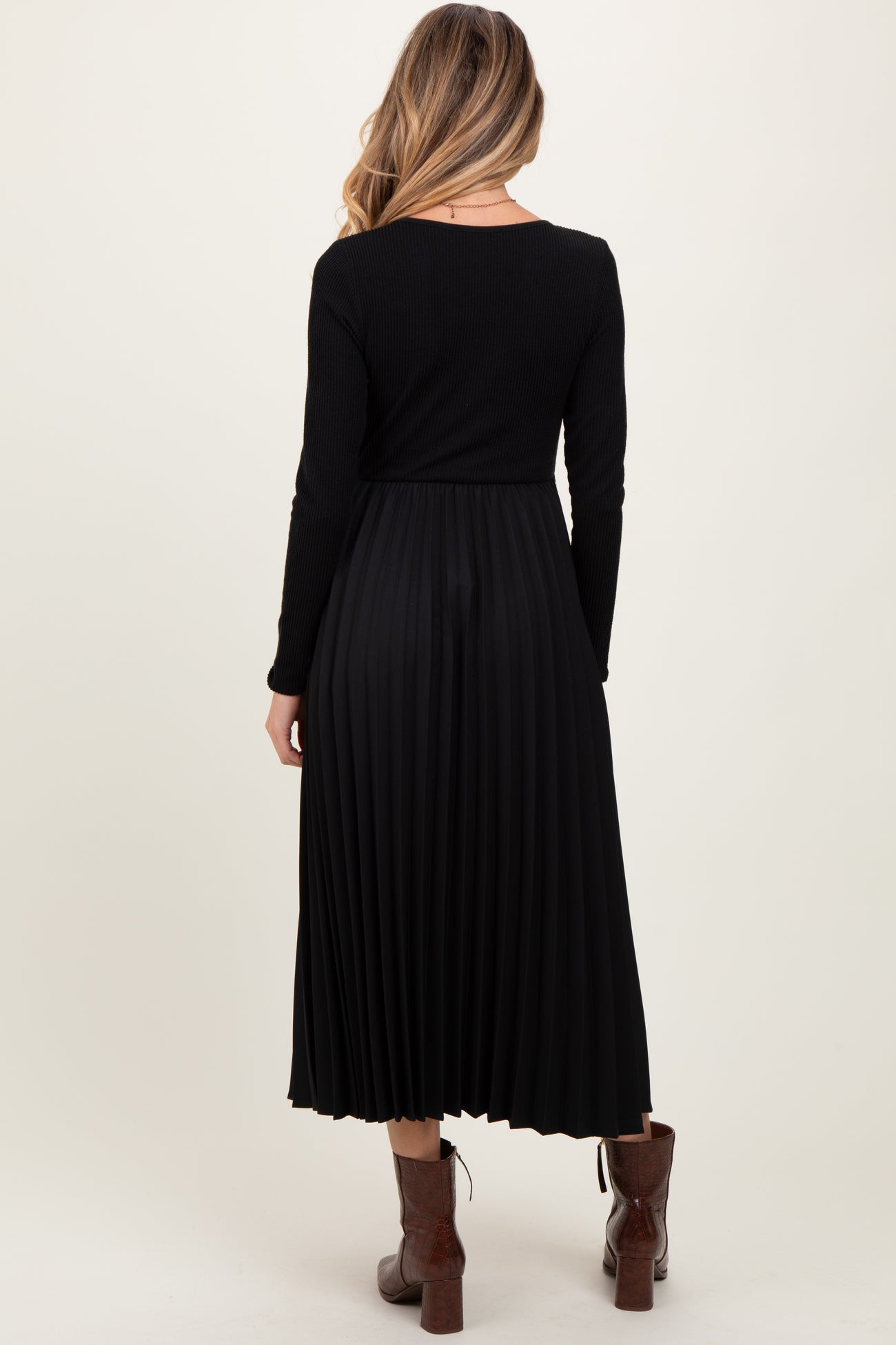Black Knit Contrast Pleated Skirt Maternity Midi Dress