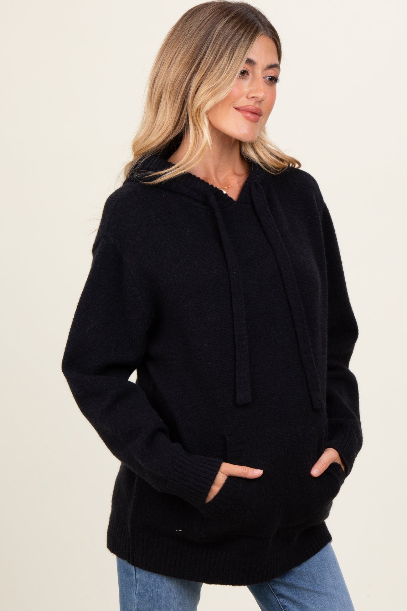 Black Knit Front Pocket Hooded Maternity Sweater