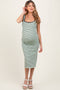 A solid ribbed knit fitted midi dress with long sleeves and a wide v-neckline.