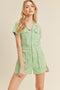 A solid jumpsuit with a large front pocket detail, adjustable button straps, and side pockets.