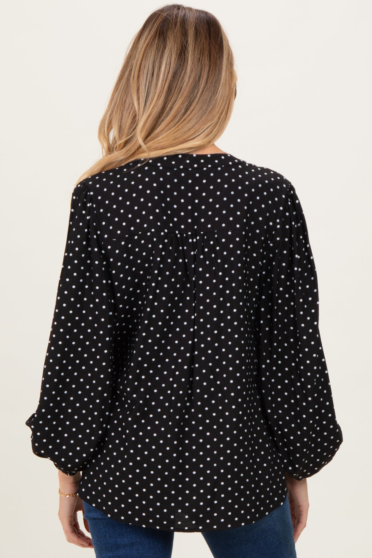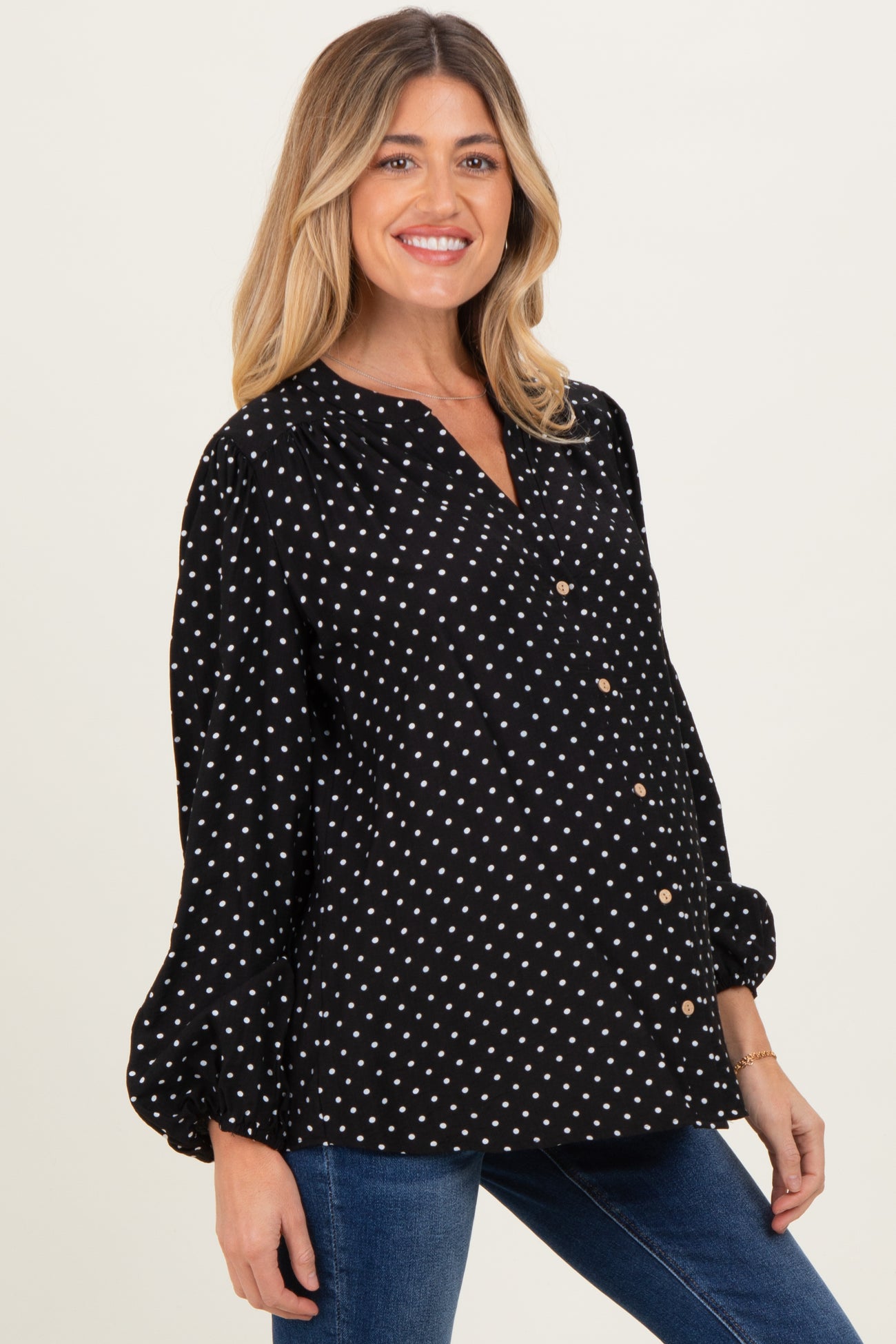 Black Polka Dot Long Sleeve Button Down V-Neck Maternity Top