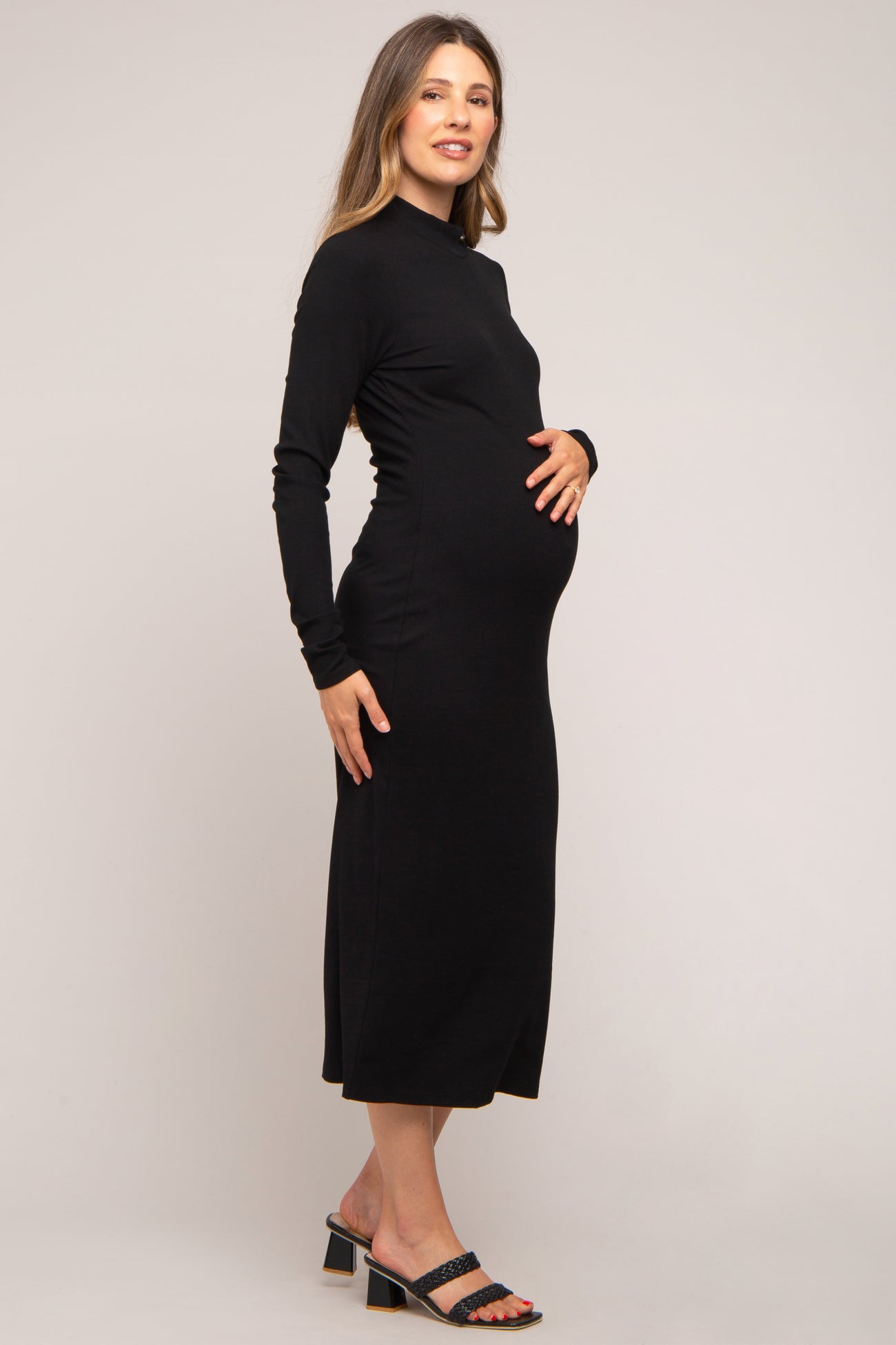 Details A solid basic ribbed maternity midi dress with a mock neckline and long sleeves. Content + Care