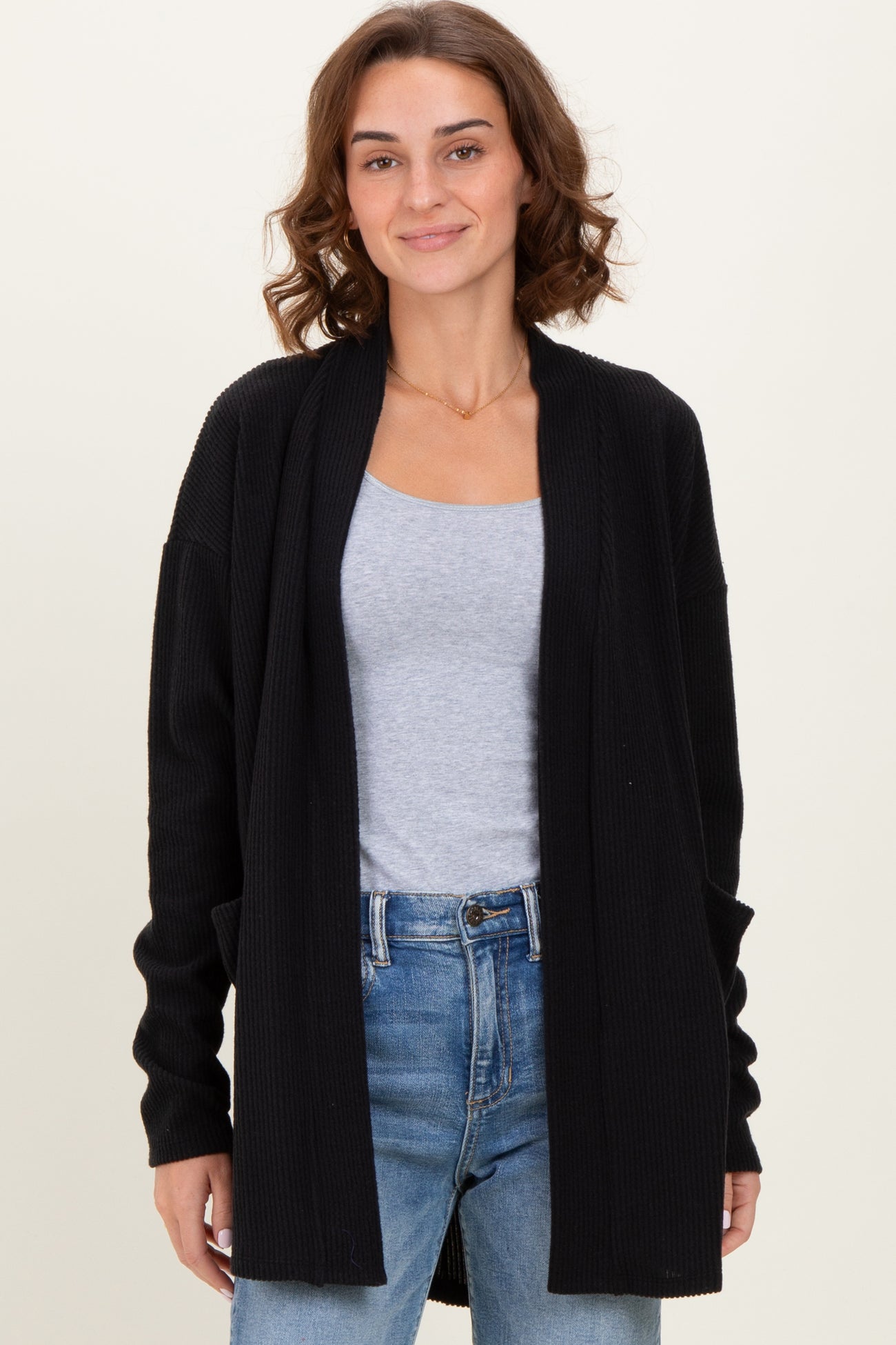 Stay cozy and stylish throughout your pregnancy with this Black Solid Ribbed Long Sleeve Maternity Cardigan. Designed with soft, ribbed fabric, this open-front cardigan offers comfort and flexibility to accommodate your growing bump. The long sleeves provide warmth, while the relaxed fit and open front create an effortlessly chic look. Featuring convenient front pockets, it's perfect for keeping essentials close or warming your hands. Pair it with your favorite maternity leggings or casual pants for everyday wear. A versatile, must-have layering piece for all seasons.