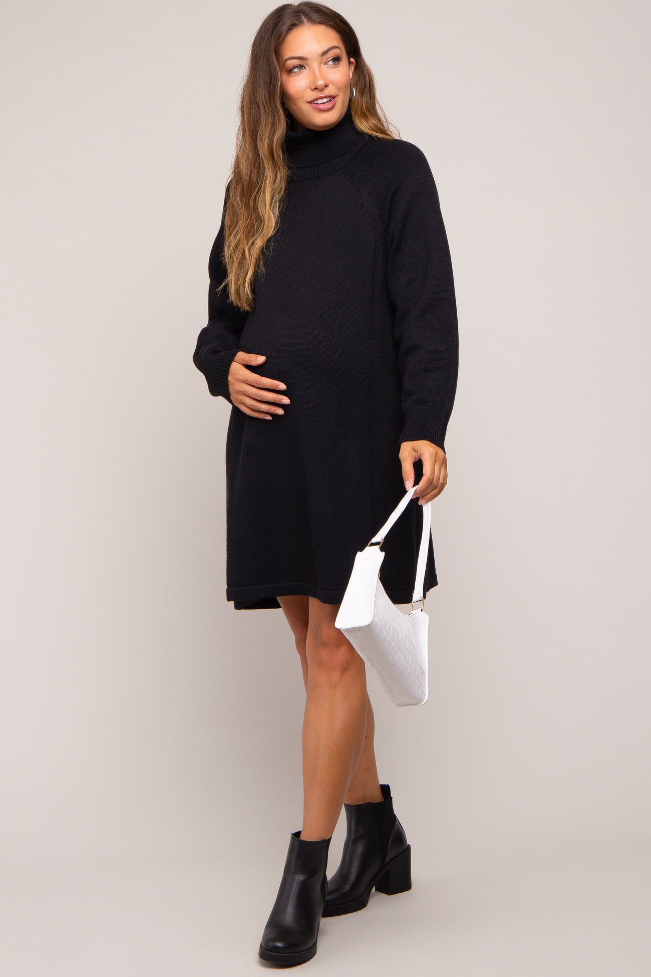 Elevate your maternity style with our Turtleneck Long Sleeve Maternity Sweater Dress. Crafted from a soft, stretchy knit, this dress gently hugs your growing bump, providing comfort and a flattering silhouette throughout pregnancy and beyond. The classic turtleneck and long sleeves keep you cozy, while the elegant design offers endless styling possibilities—from casual daywear with sneakers to chic evenings with boots. Designed to grow with you, this sweater dress is a versatile closet staple for expecting moms who love effortless elegance and unbeatable comfort.