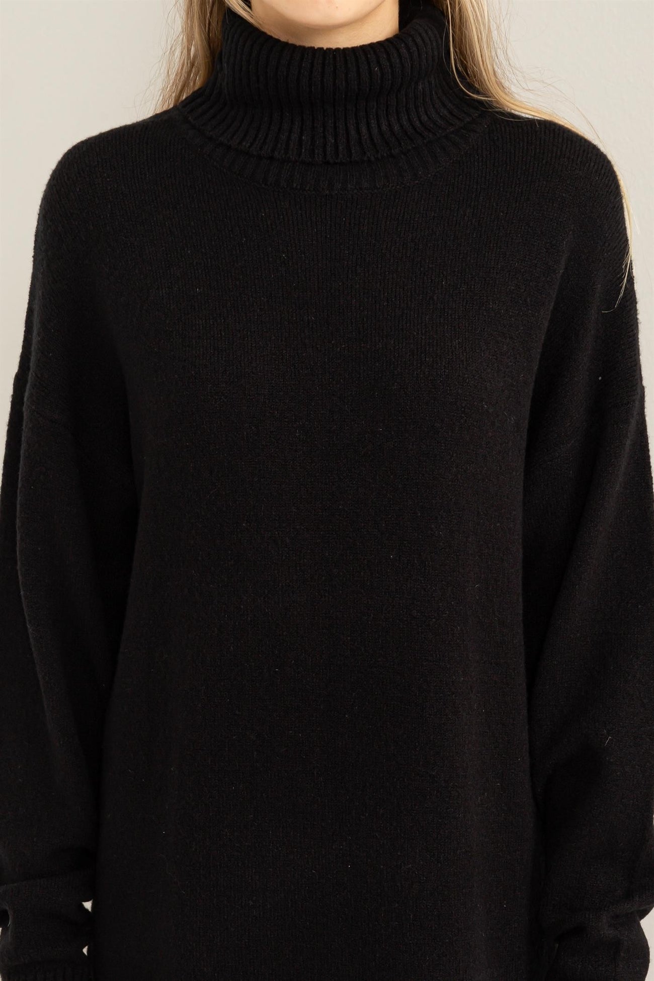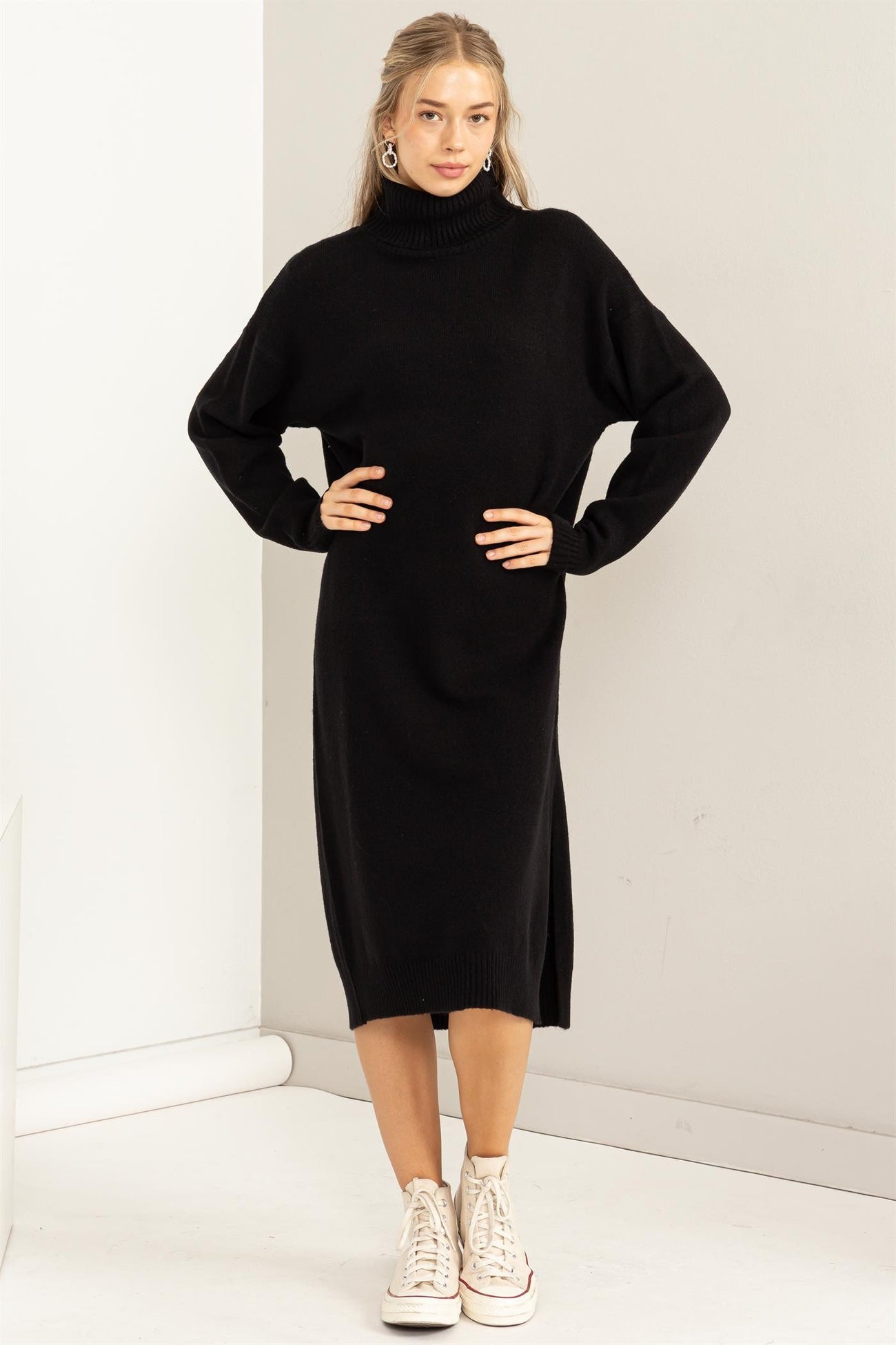 Black Turtleneck Side Slit Sweater Midi Dress