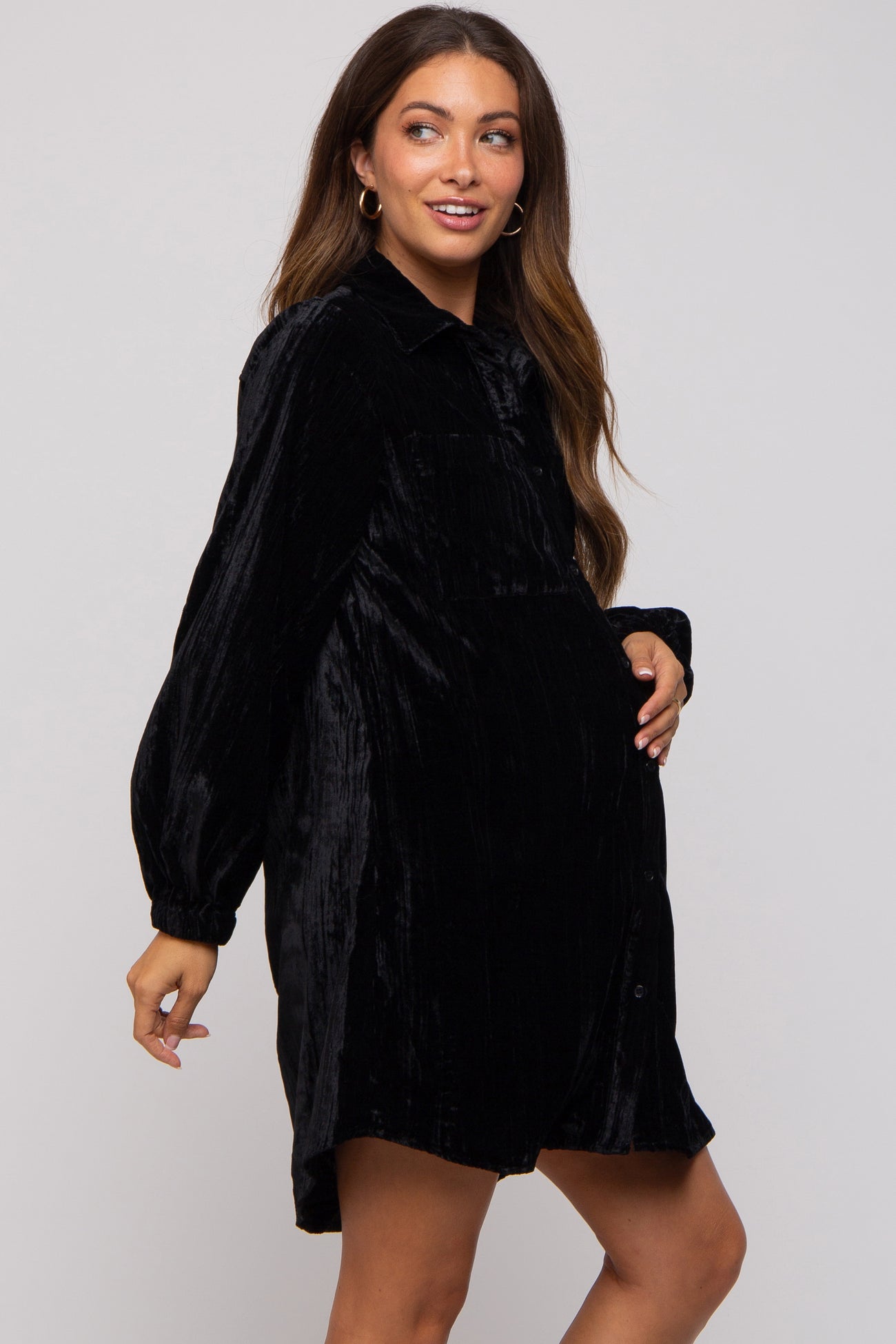 A velour maternity dress with front functioning buttons, long cinched sleeves, and front pockets.