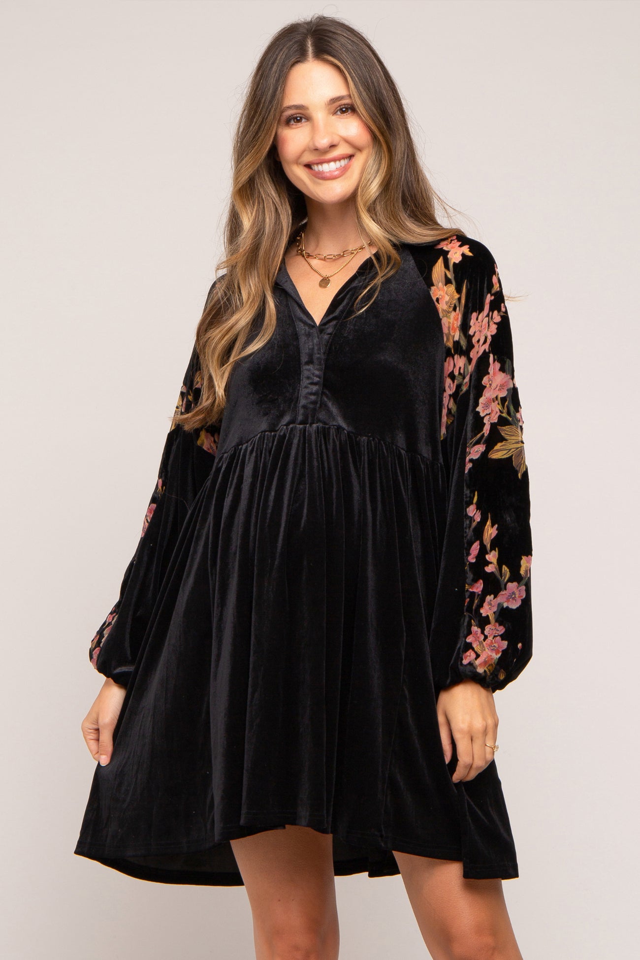 A velvet maternity dress featuring floral burnout velvet long sleeves, a collar, a split v-neckline, and a slight hi-lo hem.