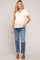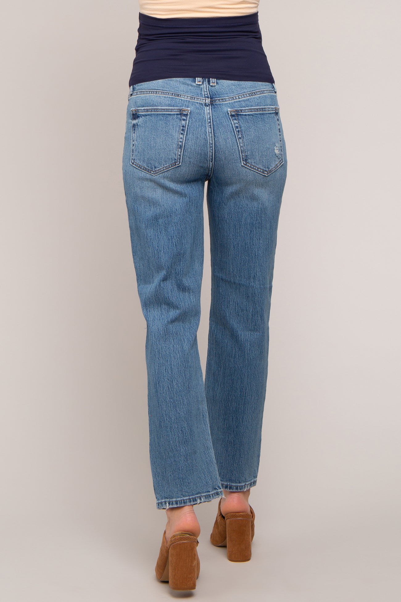 A pair of medium wash, straight leg maternity jeans featuring an elastic belly band, 5 pockets, and distressing throughout.