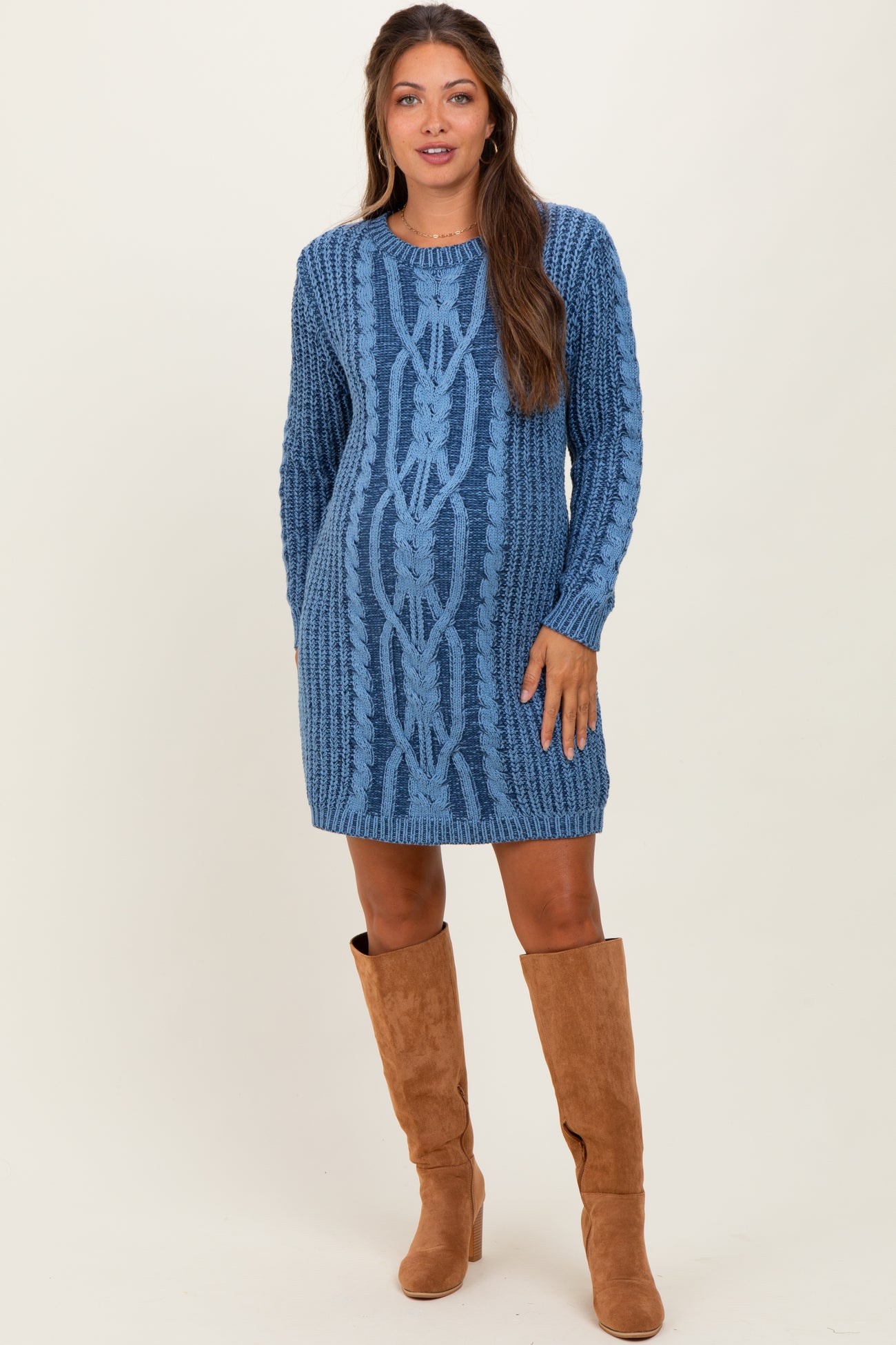 Blue Two Tone Cable Knit Maternity Mini Sweater Dress