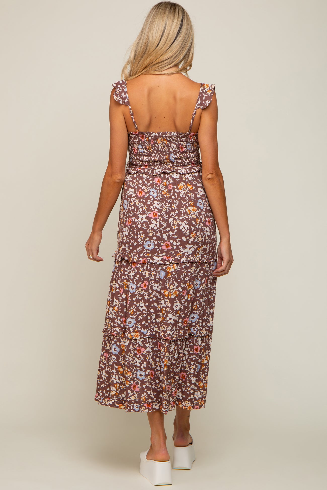 Brown Floral Cinched Tiered Maternity Midi Dress