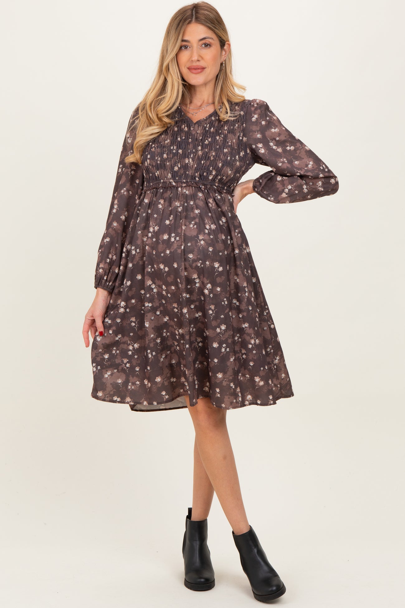 Brown Floral Smocked Long Sleeve Maternity Dress