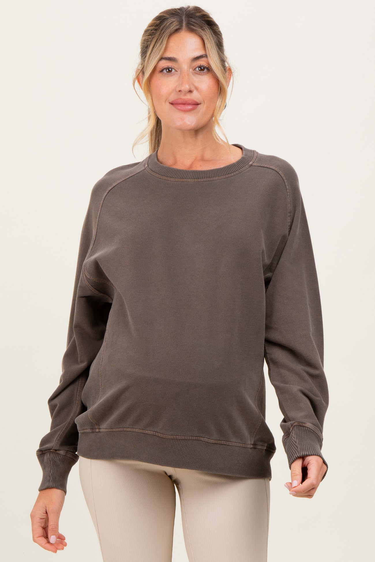 Stay cozy and stylish throughout your pregnancy with our Brown French Terry Vintage Wash Maternity Pullover. Made from soft, breathable French terry fabric, this pullover offers effortless comfort and a relaxed fit that adapts perfectly to your growing bump. Featuring a vintage wash for a worn-in, classic look, ribbed cuffs, and hem for added shape and warmth. Ideal for everyday wear, it pairs beautifully with your favorite maternity leggings or lounge pants. Easy to layer and care for, this versatile pullover is a must-have for casual maternity wardrobes. Machine washable and soft to the touch, it keeps you comfy from trimester one through postpartum.