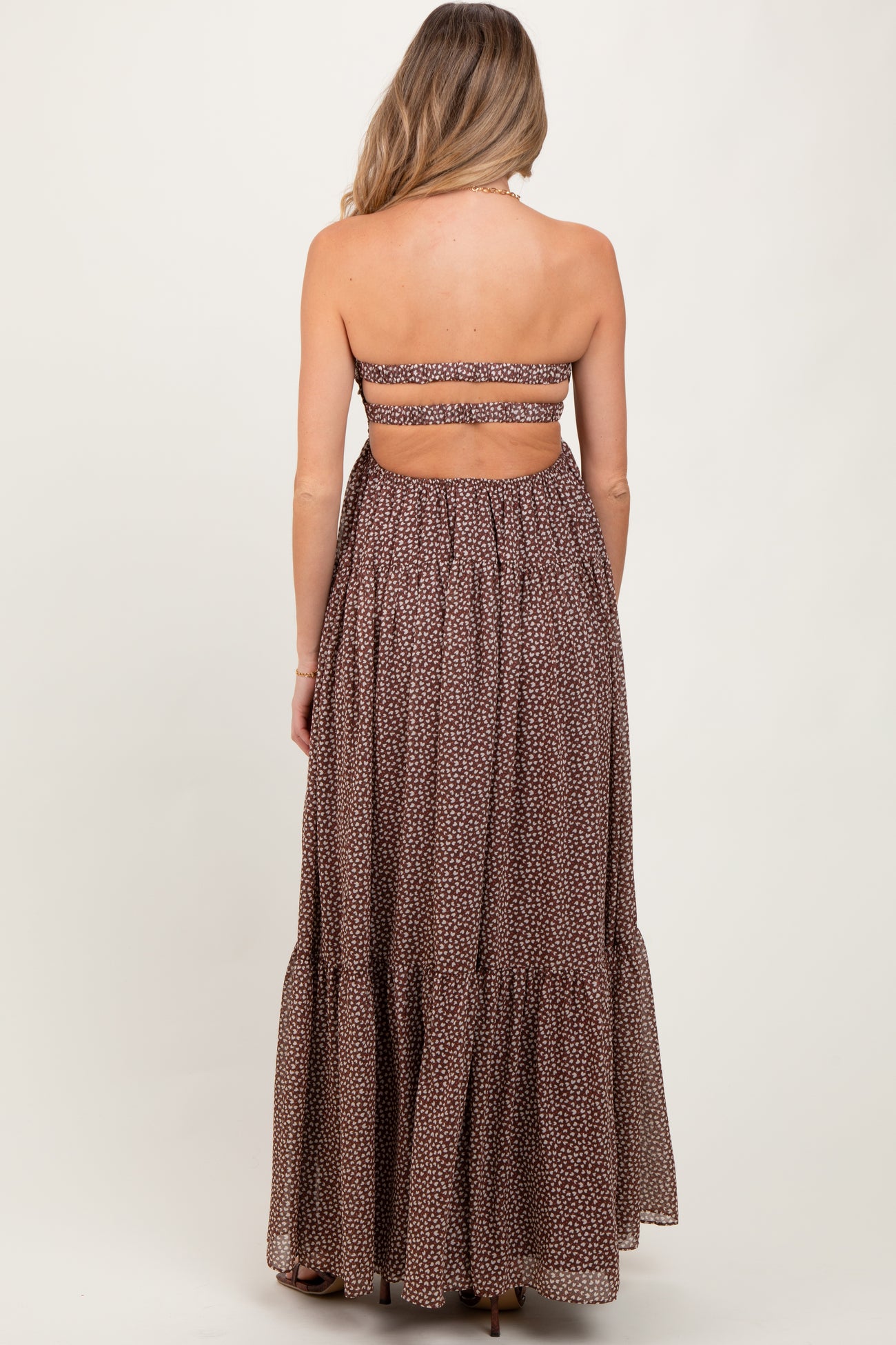 Brown Heart Print Twist Front Open Back Maternity Maxi Dress