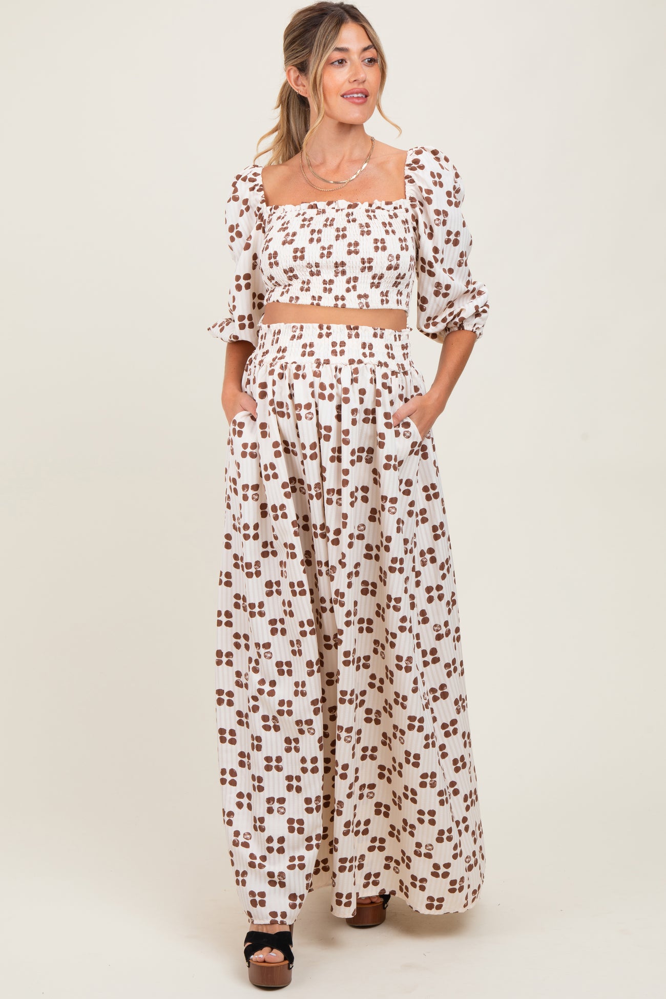 Brown Printed Smocked Crop Top Maxi Skirt Maternity Set