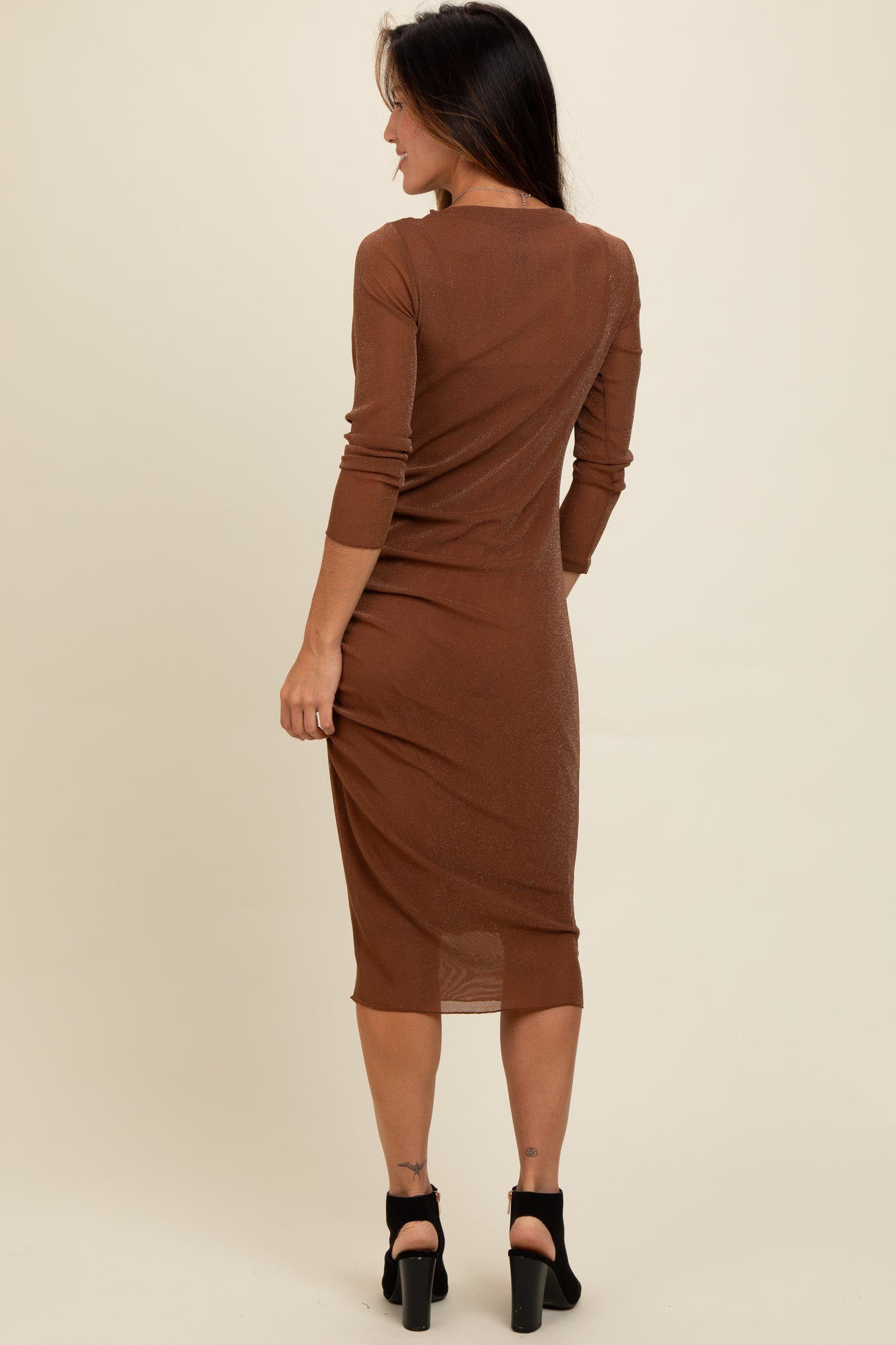 Elevate your evening look with our Brown Shimmer Mesh Long Sleeve Ruched Midi Dress. Crafted from lightweight mesh fabric with a subtle shimmer, this dress features a flattering ruched design that contours your silhouette. The midi length and long sleeves offer an elegant touch, while the round neckline keeps it classic. Perfect for special occasions, date nights, or stylish gatherings, pair it with heels and delicate jewelry for a chic finish. Comfortable, sophisticated, and effortlessly glamorous — this dress is a must-have for your wardrobe. Available in sizes S to XL.