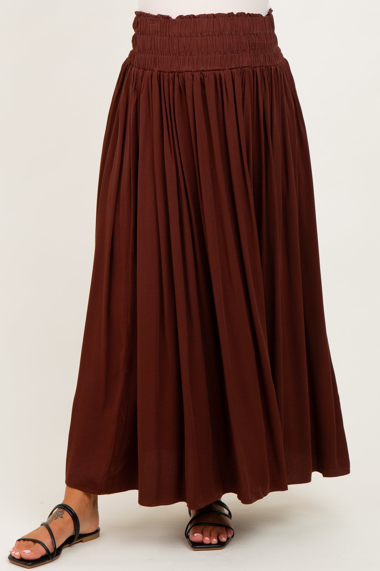 Brown Smocked Waistband Pleated Maternity Maxi Skirt