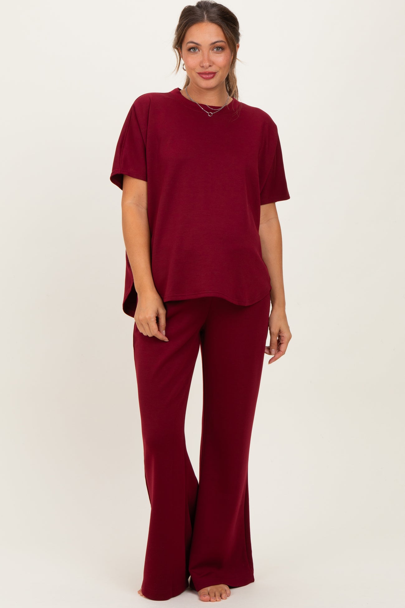 Burgundy Curved Hem Tee Pants Maternity Lounge Set