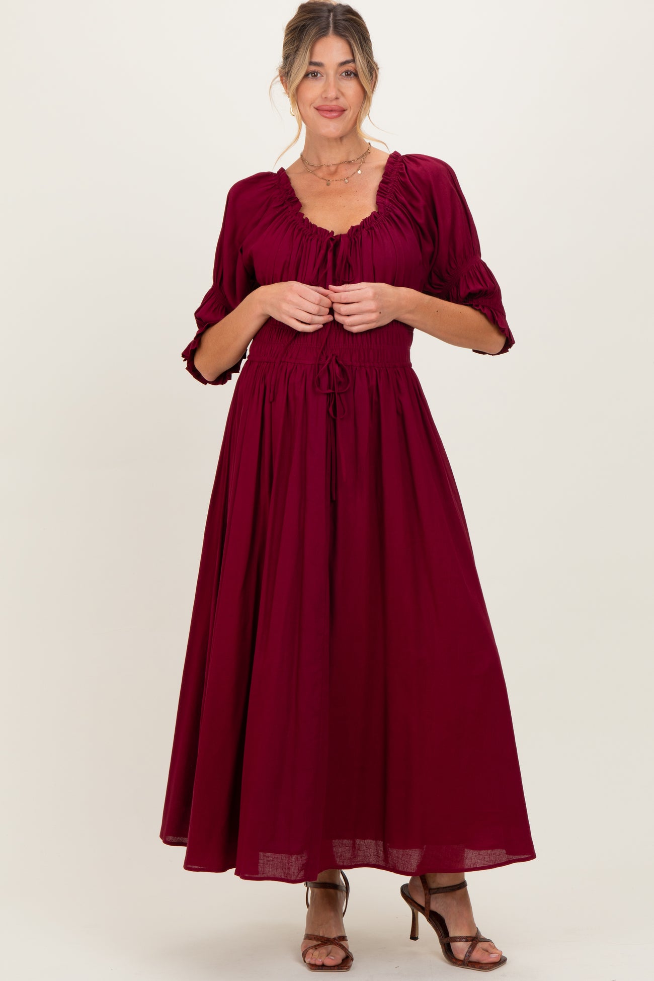 Burgundy Smocked Ruffle Square Neck Maternity Midi Dress