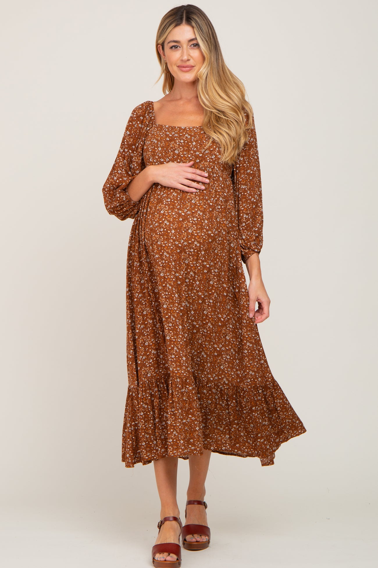 Camel Floral 3/4 Sleeve Maternity Midi Dress
