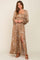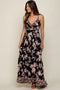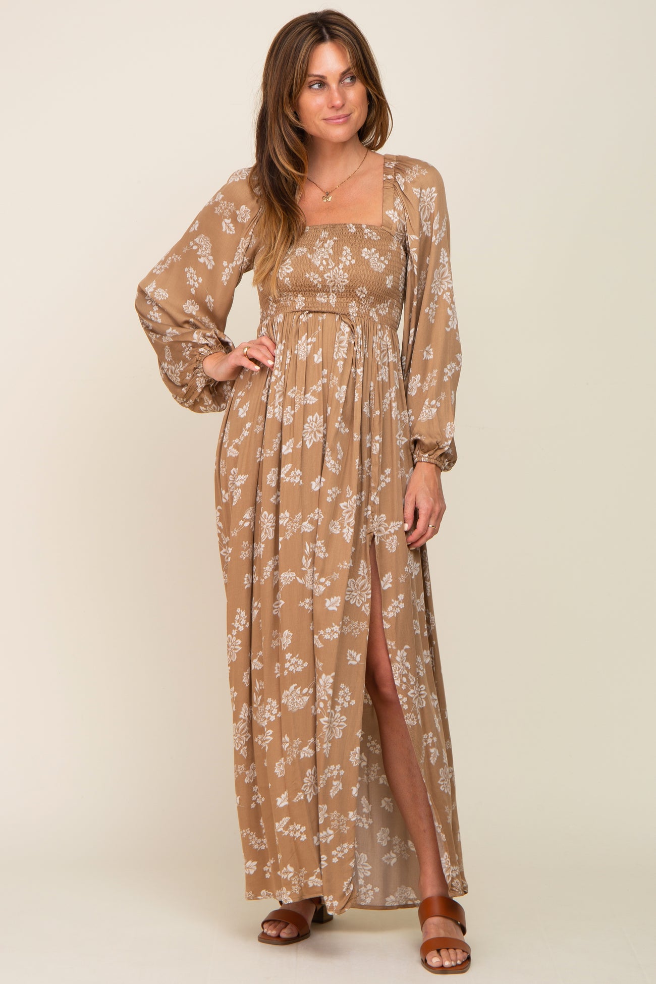 Details A floral maxi dress. Features a smocked top, a squared neckline, long sleeves, a back tie, and a side slit. Content + Care