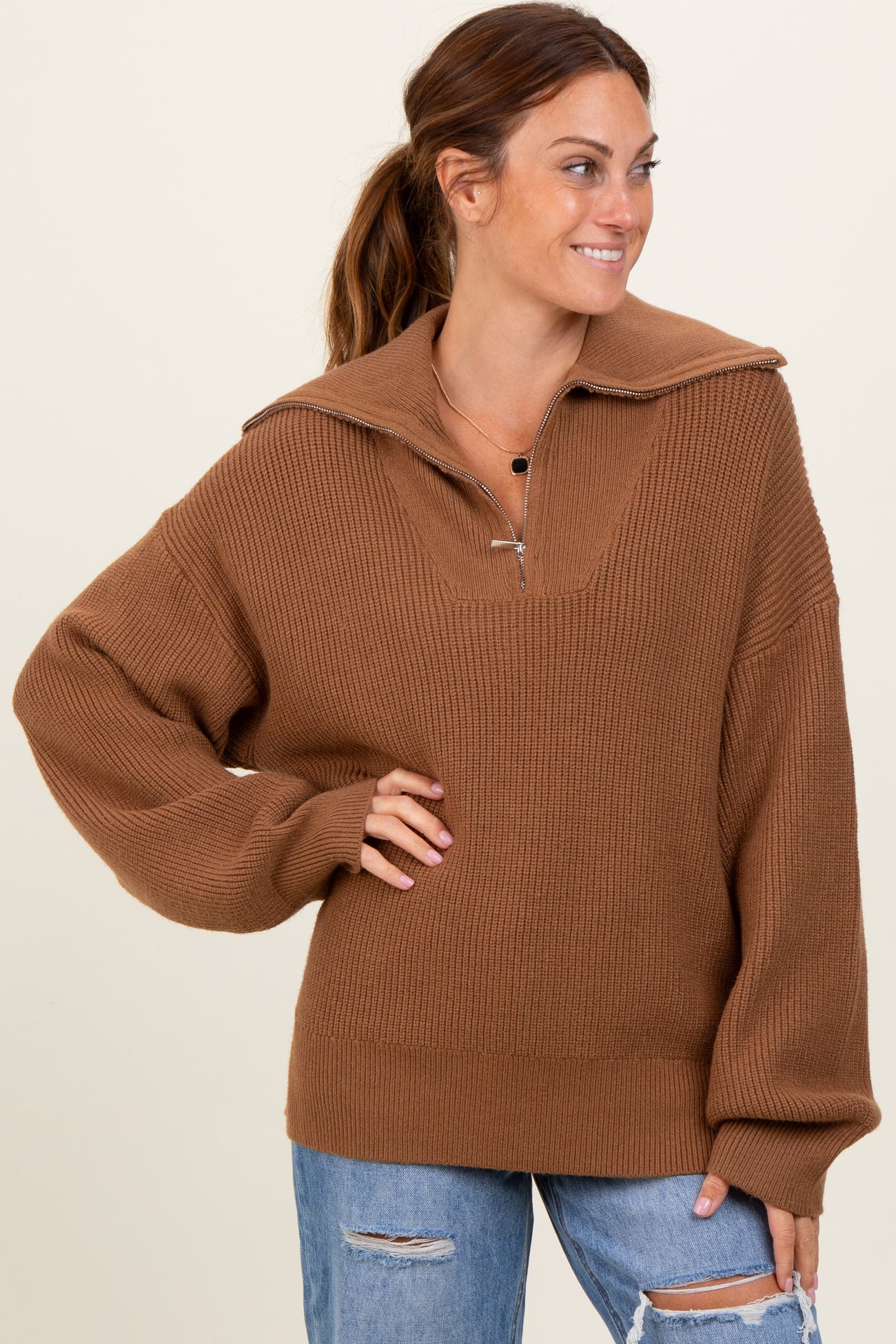 Camel Half Zip Chunky Knit Maternity Pullover Sweater
