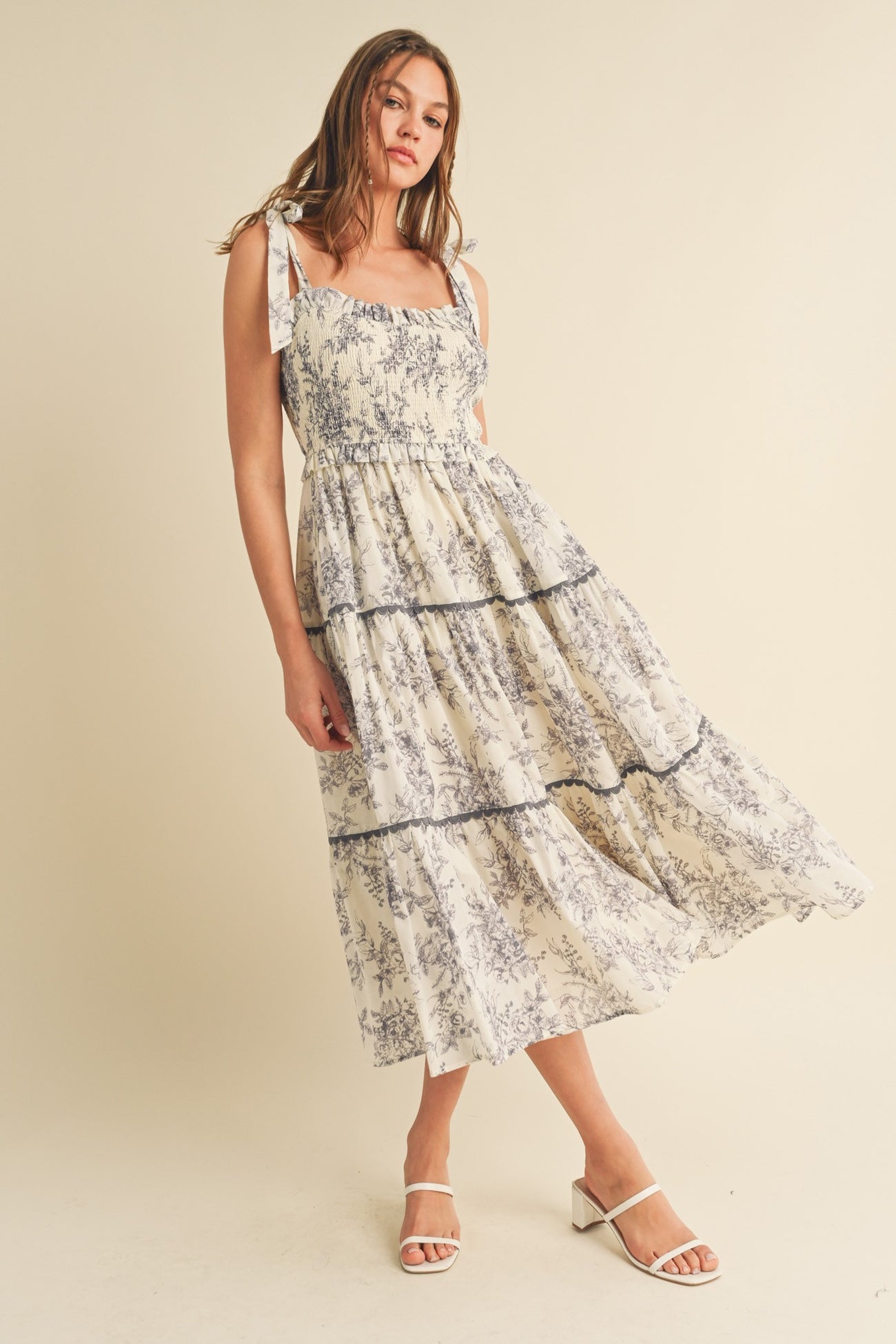 A floral sleeveless midi dress featuring knotted shoulder straps, a smocked top, side pockets, a tiered skirt and a square neckline.