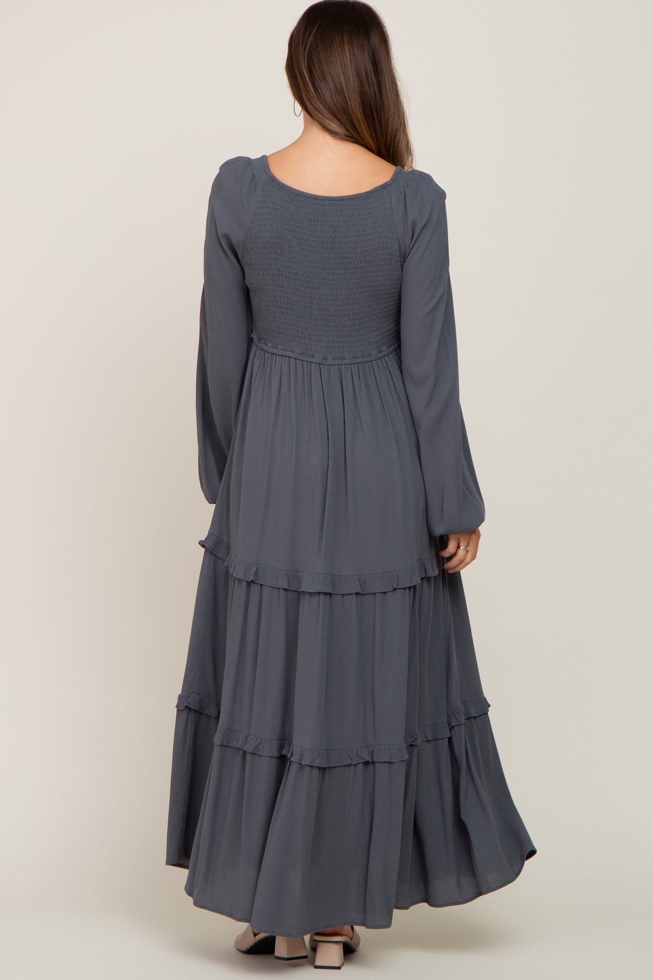 Details A solid maternity midi dress with a v-neckline, smocked bodice, bubble sleeves and tiered skirt. Skirt is double lined. Content + Care