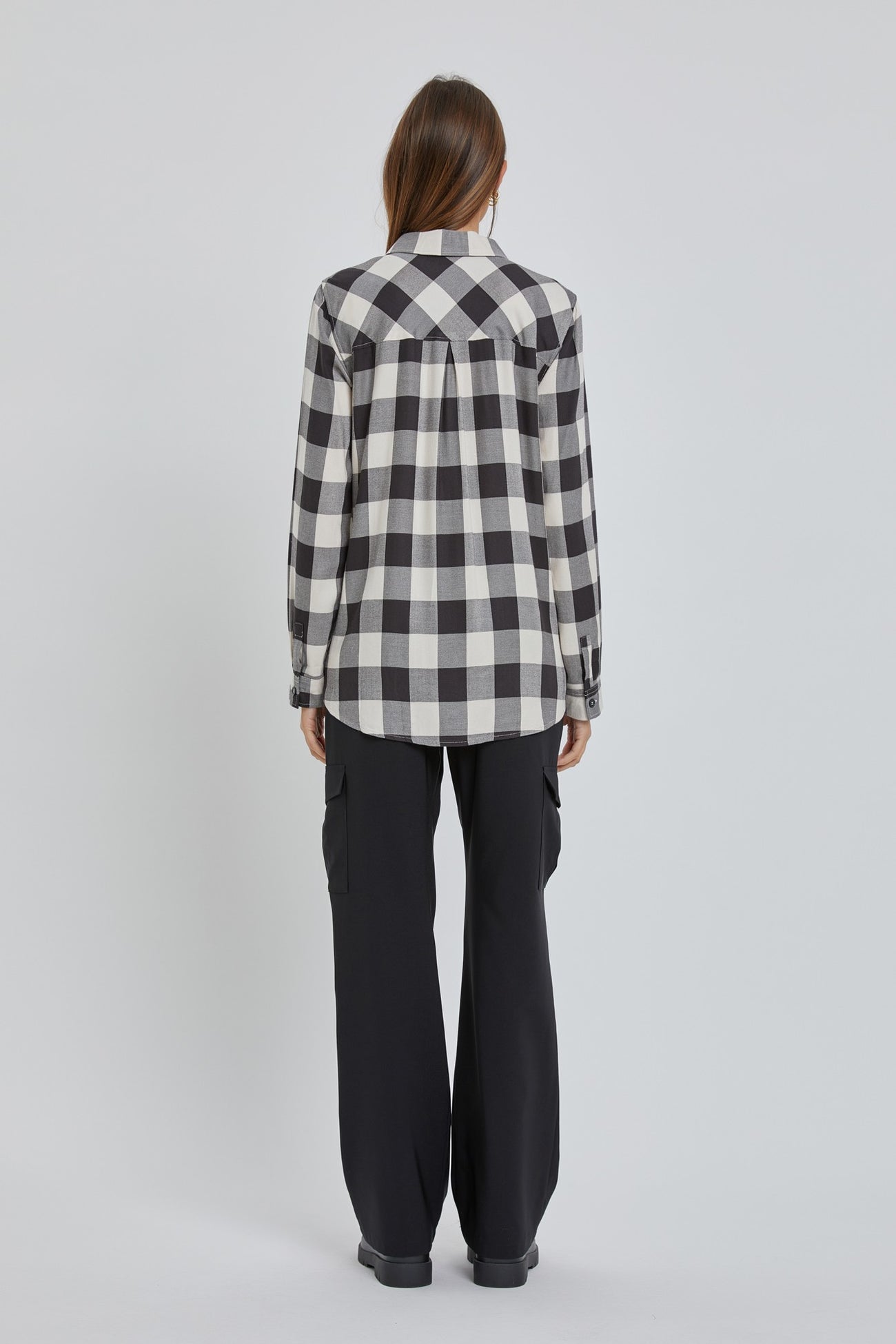 Details A plaid long sleeve top with a collared neckline and button down front. Also includes front chest pocket. Content + Care